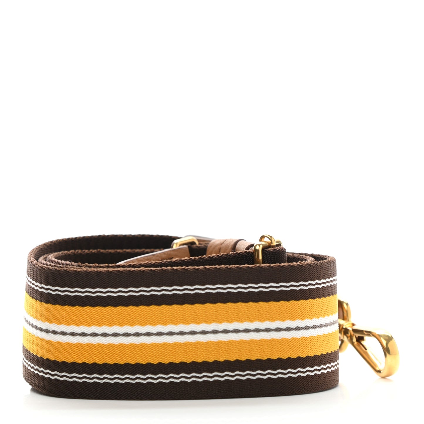 This is an authentic PRADA Vitello Daino Striped Fabric Shoulder Strap. This strap is crafted of fabric and leather in brown and yellow with aged gold metal clasps for your tote or other Prada handbags.Follow this item for alerts. Prada is a registered trademark of Prada. FASHIONPHILE is not affiliated with Prada.