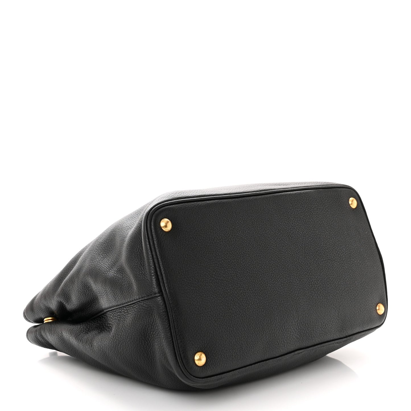 This is an authentic PRADA Vitello Daino Tote in Black. This stunning tote is beautifully crafted of grained calfskin leather in black. The bag features rolled leather top handles, an optional shoulder strap, and gold hardware. The top is open to a spacious black jacquard fabric interior with a zipper and patch pocket.Follow this item for alerts. Prada is a registered trademark of Prada. FASHIONPHILE is not affiliated with Prada.