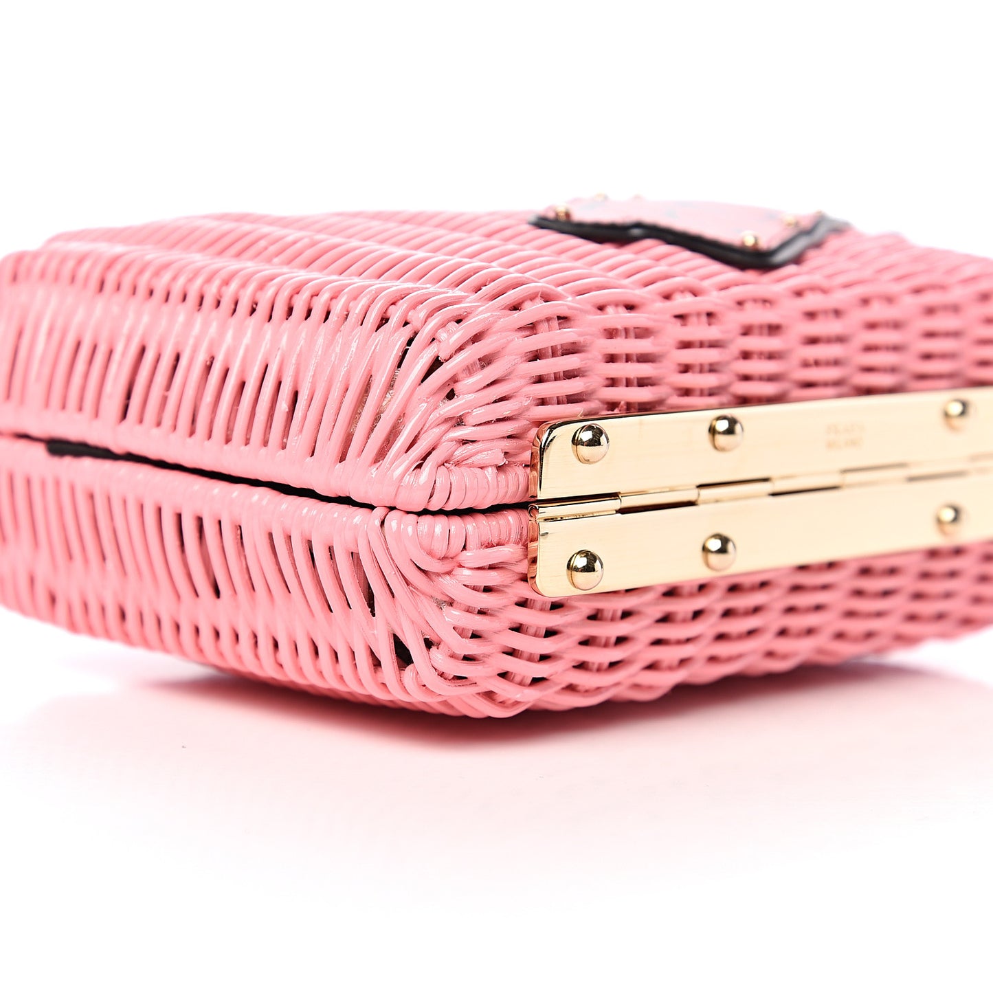 This is an authentic PRADA Wicker Saffiano Logo Crossbody Clutch in Petalo and Black. This delightful handbag is crafted of pink wicker with an optional leather shoulder strap and a Prada gold hardware lock. The top opens to a black canvas interior with a patch pocket. This is a stylish shoulder bag with the sophistication from Prada!
