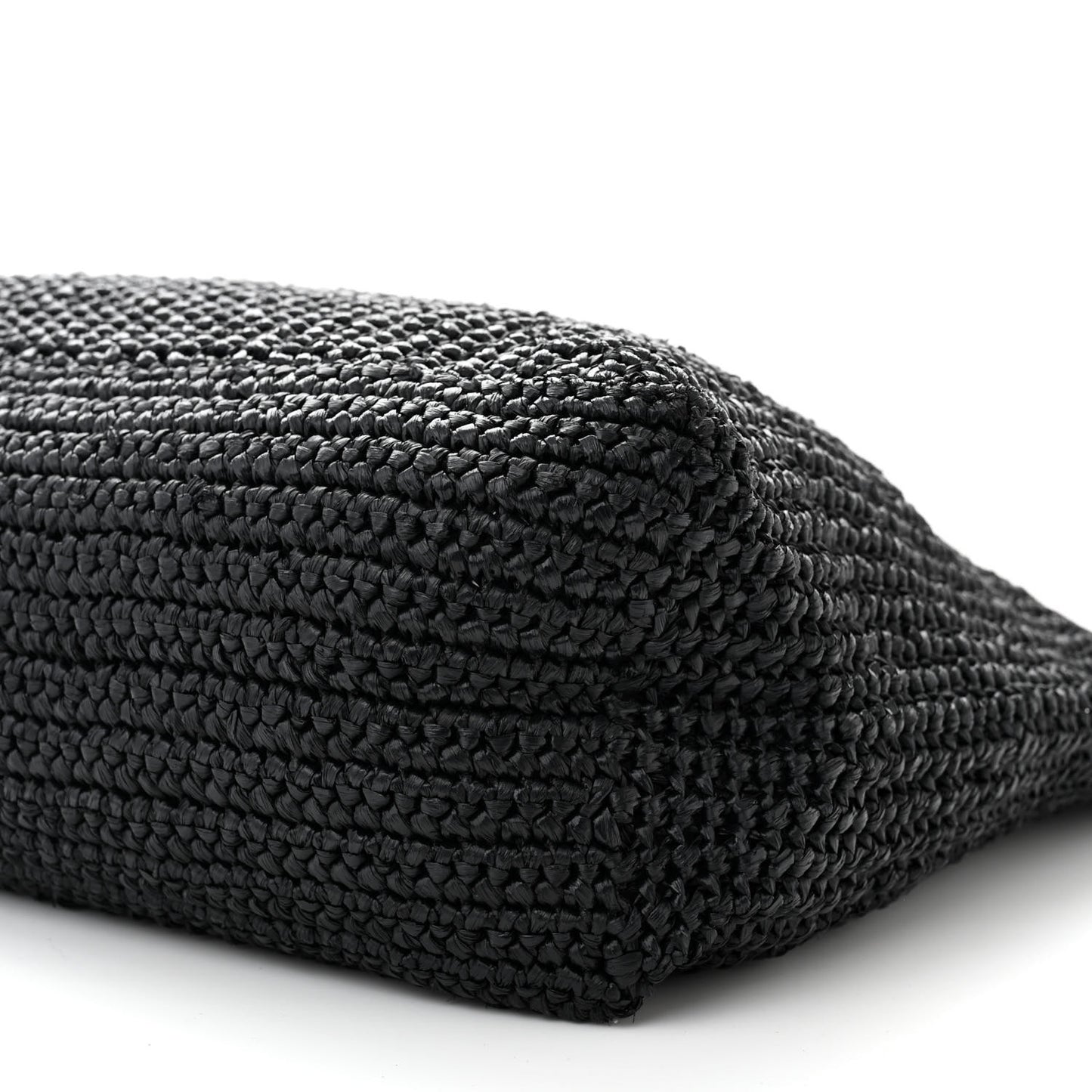 This is an authentic PRADA Yarn Raffia Effect Crochet Large Logo Tote in Black. This is uniquely structured and beautifully crafted of fine, tightly woven raffia with an embroidered logo.