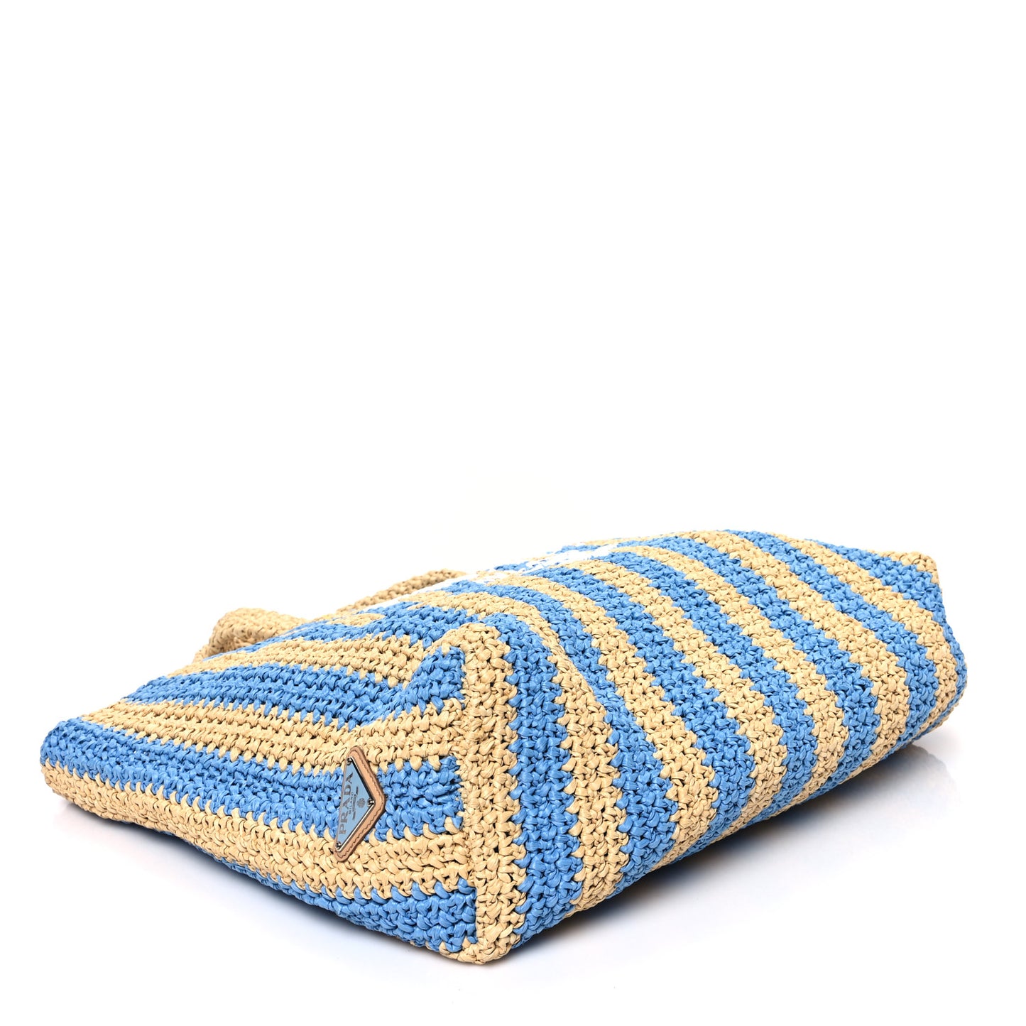 This is an authentic PRADA Yarn Raffia Effect Crochet Striped Large Logo Tote in Naturale and Celeste. This is uniquely structured and beautifully crafted of fine, tightly woven raffia with an embroidered logo.Follow this item for alerts. Prada is a registered trademark of Prada. FASHIONPHILE is not affiliated with Prada.
