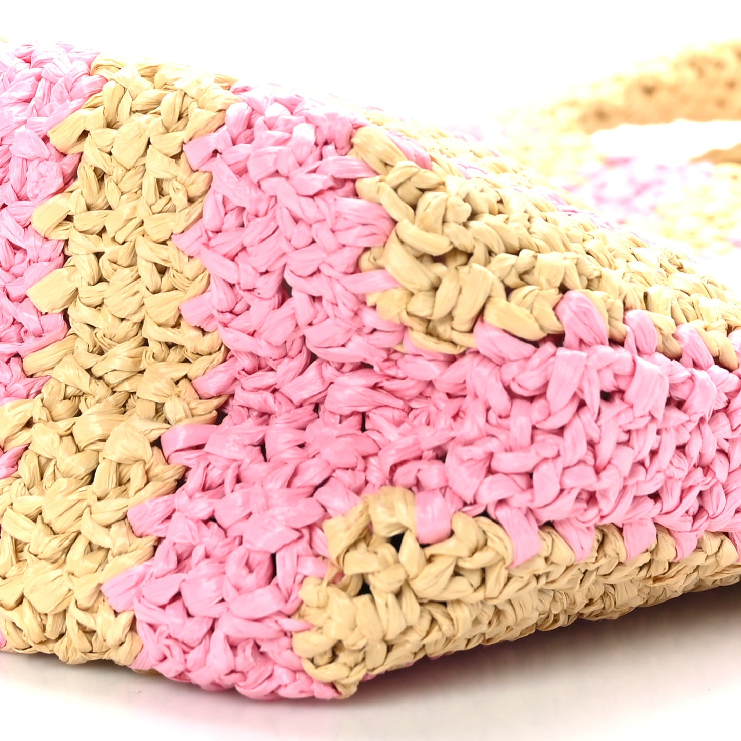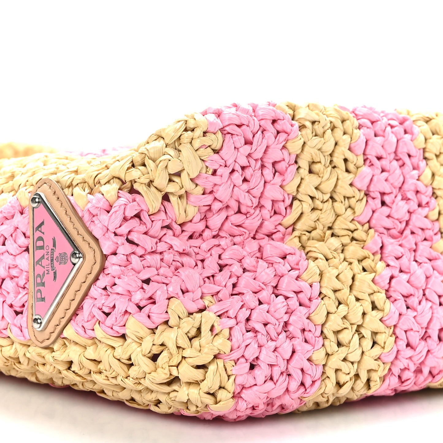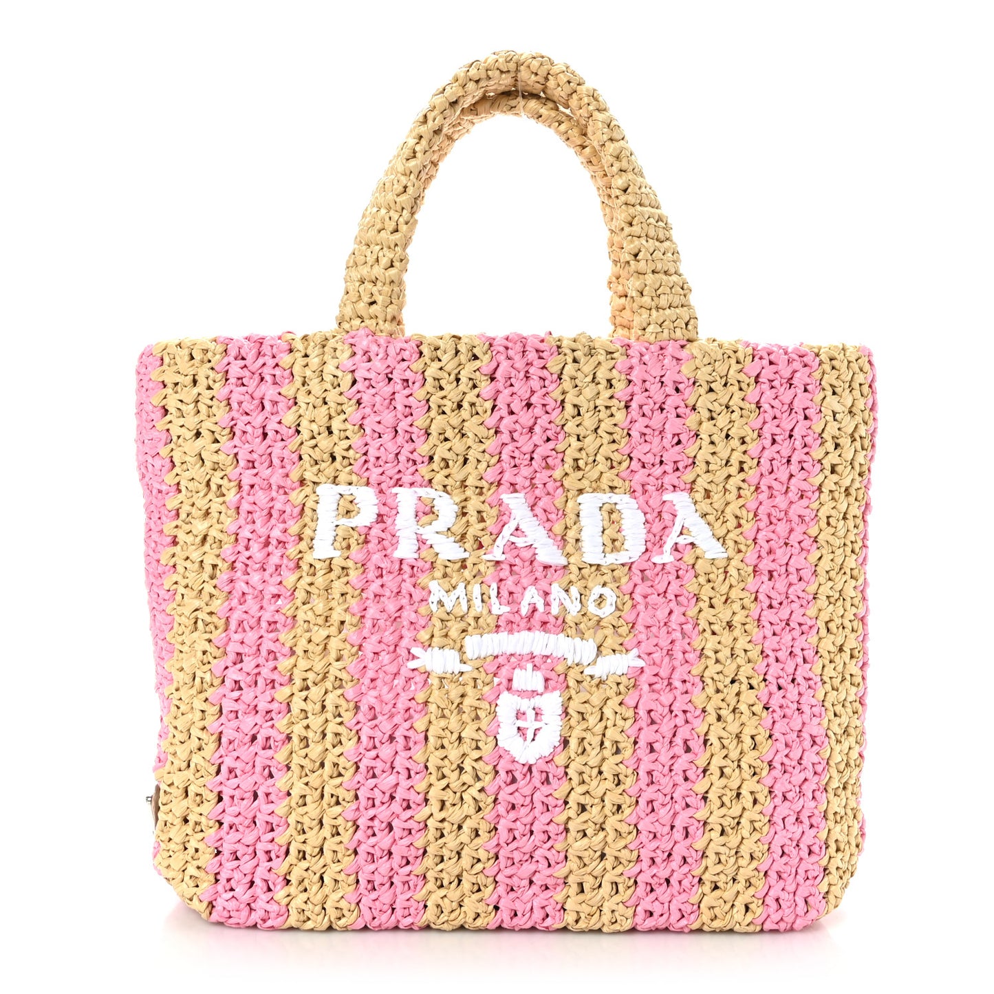This is an authentic PRADA Yarn Raffia Effect Crochet Striped Small Logo Tote in Naturale and Petalo. This is uniquely structured and beautifully crafted of fine, tightly woven raffia with an embroidered logo.Follow this item for alerts. Prada is a registered trademark of Prada. FASHIONPHILE is not affiliated with Prada.