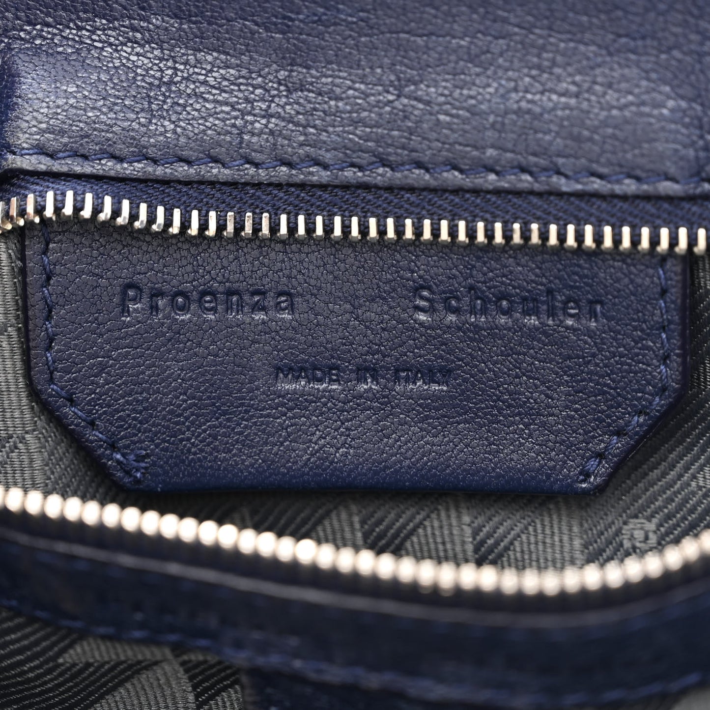 This is an authentic PROENZA SCHOULER Lambskin Medium PS1 Satchel in Midnight. This stylish handbag is made of soft lambskin leather in navy blue. It features a leather top handle, an optional shoulder strap, and an exterior of belts with aged silver hardware including a switch lock for the front flap. This opens to a grey and blue fabric interior with a zipper pocket as well as front pockets.Follow this item for alerts. Proenza Schouler is a registered trademark of Proenza Schouler. FASHIONPHILE is not affiliated with Proenza Schouler.