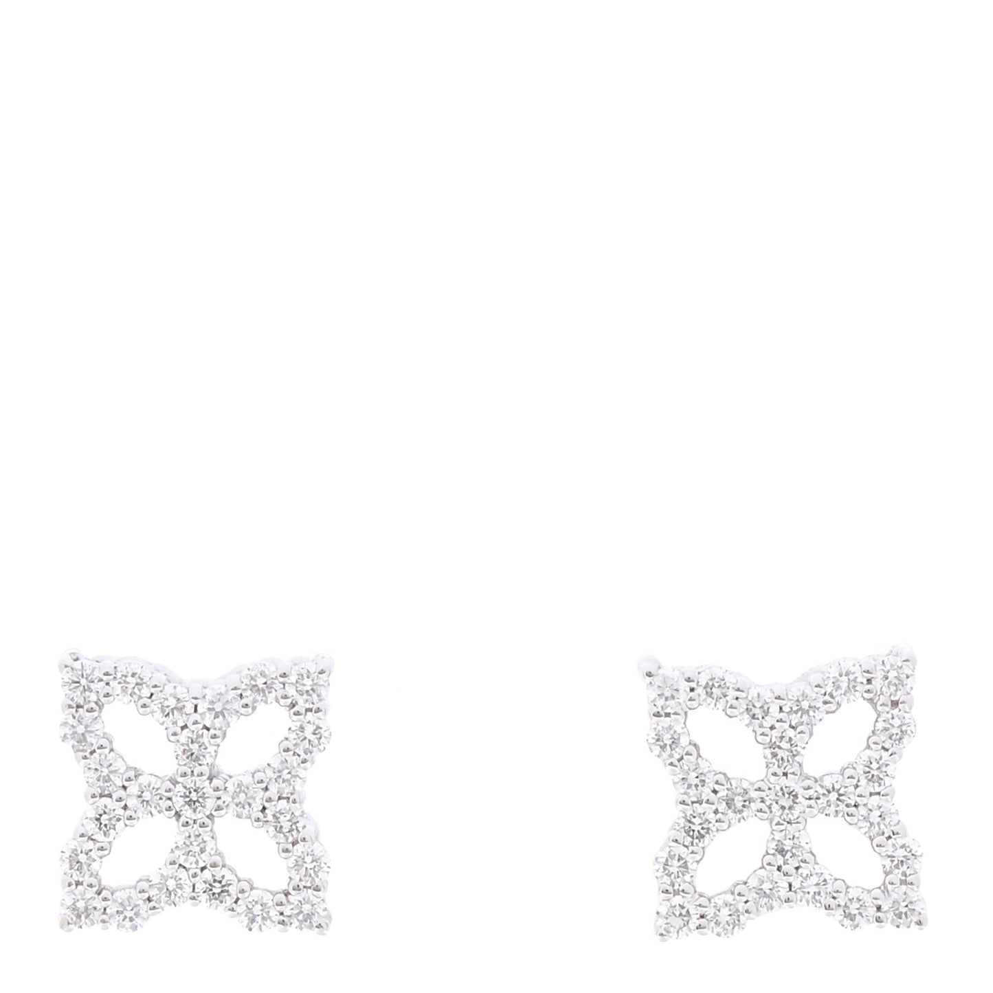 This is an authentic ROBERTO COIN 18K White Gold Diamond Pave 8mm Princess Flower Small Stud Earrings. The earrings are crafted of 18 karat white gold and feature a quatrefoil motif accented with round cut diamonds weighing approximately .39 total carat weight.Follow this item for alerts. Roberto Coin is a registered trademark of Roberto Coin. FASHIONPHILE is not affiliated with Roberto Coin.