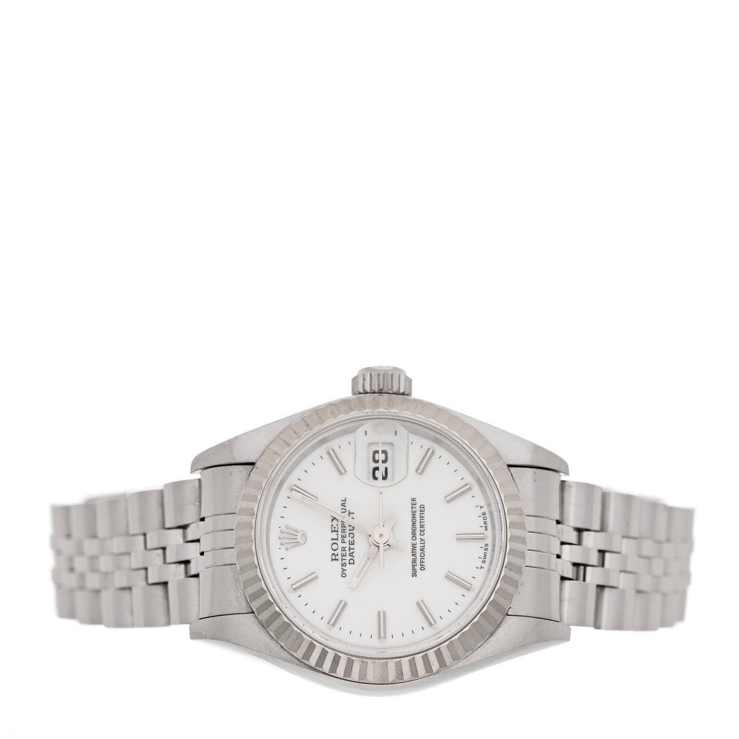 This is an authentic ROLEX Stainless Steel 18K White Gold 26mm Oyster Perpetual Datejust Watch in White 69174. The watch is crafted of stainless steel, and features a fluted white gold bezel, white dial, date display, sapphire crystal, and an automatic movement.Follow this item for alerts. Rolex is a registered trademark of Rolex. FASHIONPHILE is not affiliated with Rolex.