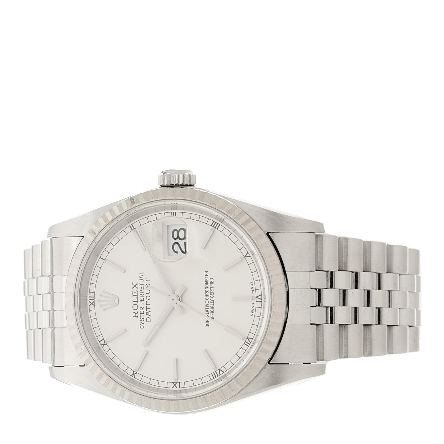 This is an authentic ROLEX Stainless Steel 18K White Gold 36mm Oyster Perpetual Datejust Watch Silver 16234. The watch is crafted from stainless steel and 18 karat white gold, and features an automatic movement with a date complication, silver dial, fluted bezel, and Jubilee bracelet.Follow this item for alerts. Rolex is a registered trademark of Rolex. FASHIONPHILE is not affiliated with Rolex.