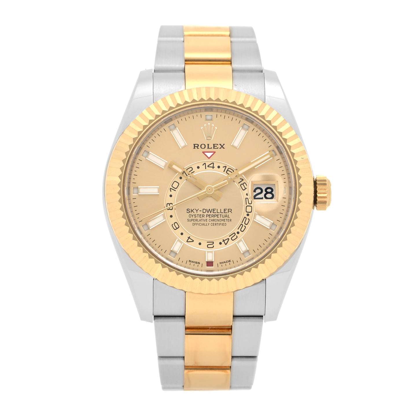 This is an authentic ROLEX Stainless Steel 18K Yellow Gold 42mm Oyster Perpetual Sky-Dweller Watch Champagne 326933. This watch is crafted in stainless steel and 18K Yellow Gold and features a champagne dial, GMT complication, sapphire crystal and an automatic movement.Follow this item for alerts. Rolex is a registered trademark of Rolex. FASHIONPHILE is not affiliated with Rolex.