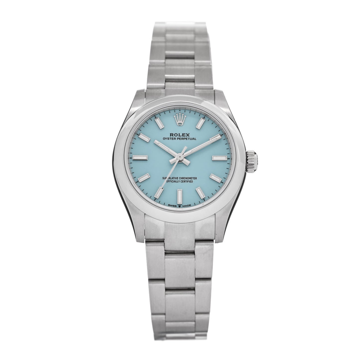 This is an authentic ROLEX Stainless Steel 31mm Oyster Perpetual Watch Turquoise 277200. This watch is crafted from stainless steel and features an automatic movement, turquoise blue dial, luminous hands and hour markers, domed bezel, sapphire crystal, and Oyster bracelet.Follow this item for alerts. Rolex is a registered trademark of Rolex. FASHIONPHILE is not affiliated with Rolex.