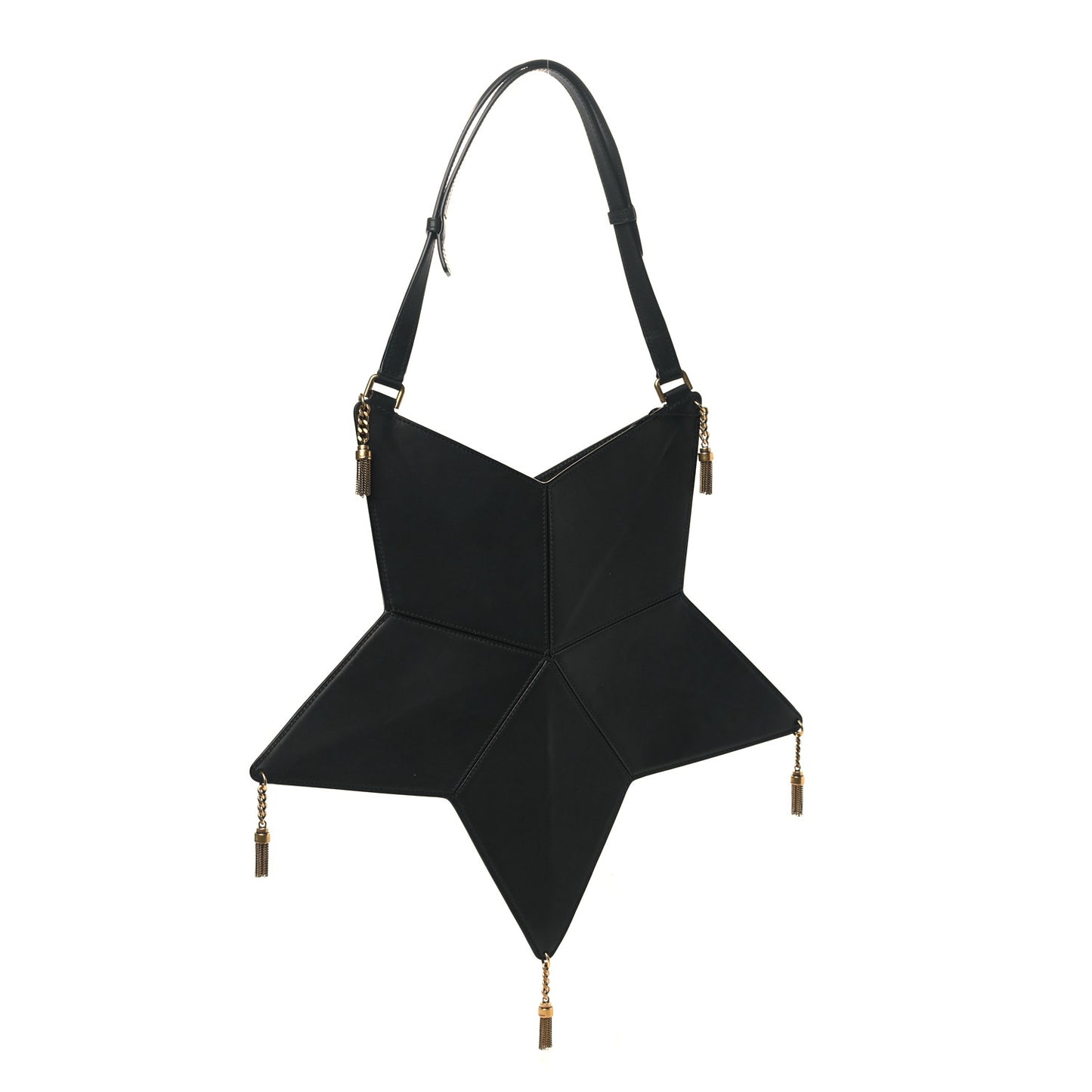 This is an authentic SAINT LAURENT Calfskin Astro Tassel Shoulder Bag in Black. This chic star-shaped shoulder bag is crafted of smooth calfskin leather in black. It features small aged gold chain tassels attached to each corner and an adjustable shoulder strap. The bag has an open top and a compact matching black leather interior.Follow this item for alerts. Saint Laurent is a registered trademark of Saint Laurent. FASHIONPHILE is not affiliated with Saint Laurent.