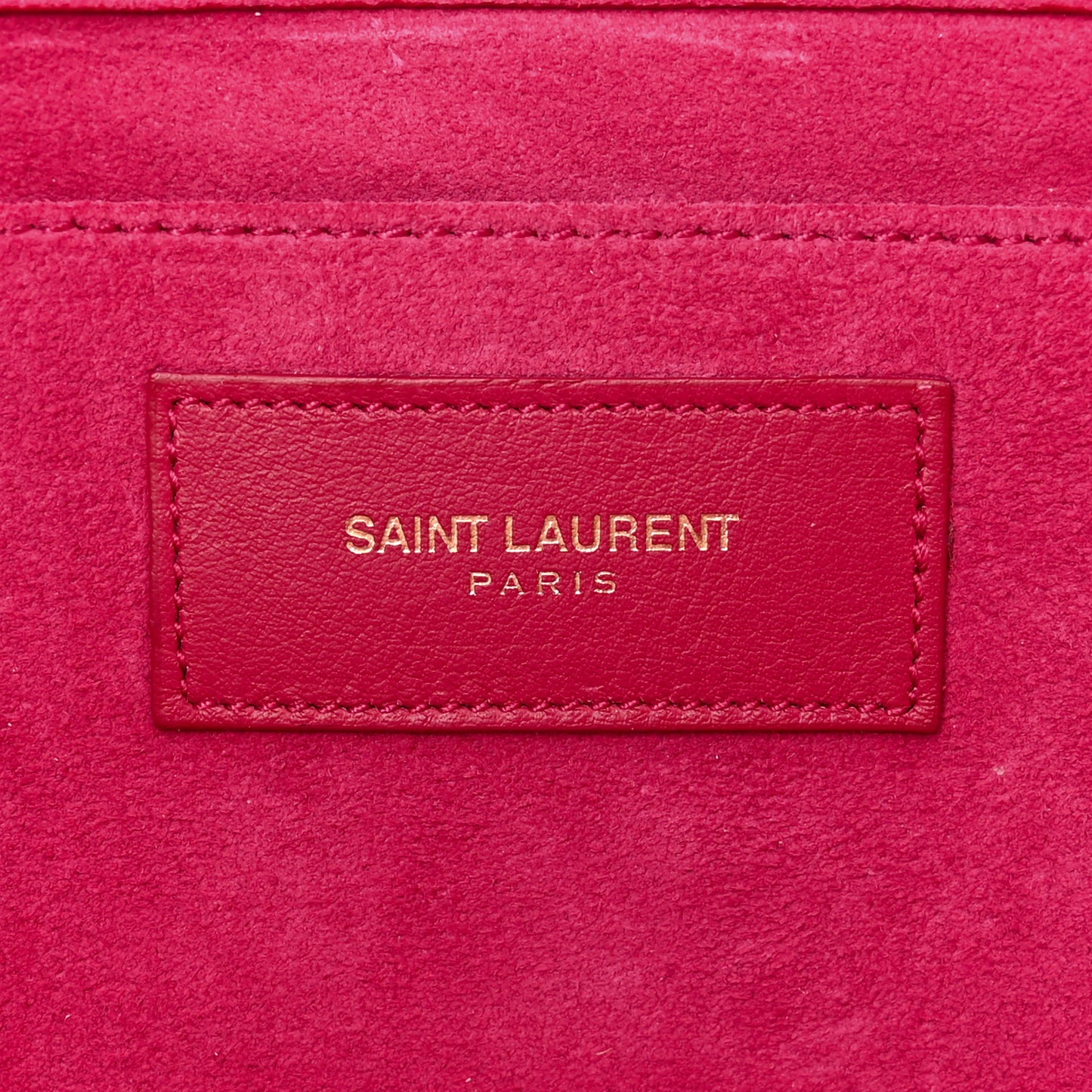 This is an authentic SAINT LAURENT Calfskin Classic Y Ligne Clutch in Fuchsia. This stylish clutch is crafted of finely grained calfskin leather in pink. The clutch features a facing flap that is secured with a strap and a gold Y logo closure. The flap opens to a matching suede interior with a patch pocket.Follow this item for alerts. Saint Laurent is a registered trademark of Saint Laurent. FASHIONPHILE is not affiliated with Saint Laurent.