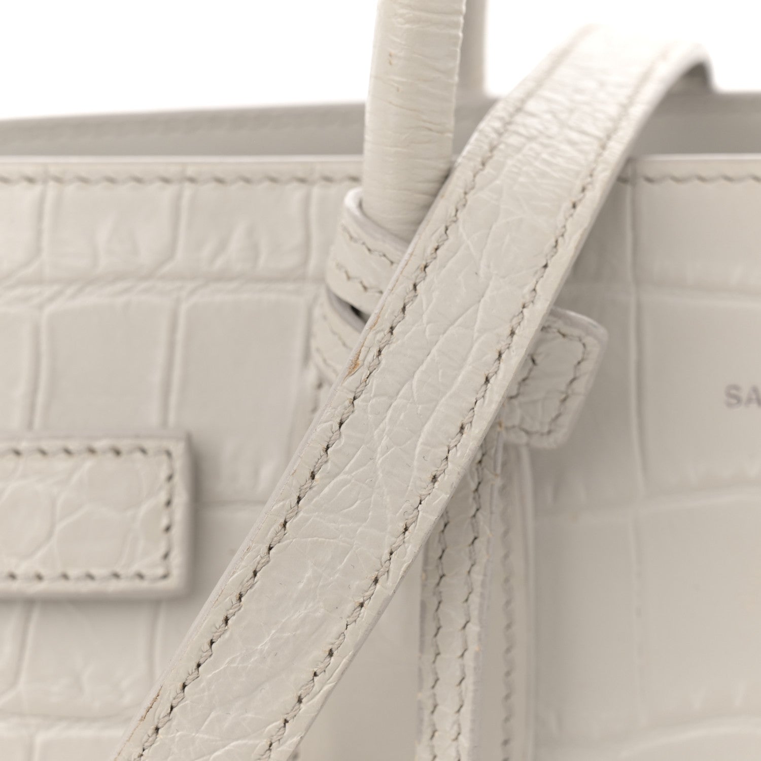 This is an authentic SAINT LAURENT Calfskin Crocodile Embossed Baby Sac De Jour in Gris Perle. This elegant mini tote is crafted of crocodile embossed leather and features rolled leather top handles, a long crossbody strap, and cinch strap expandable sides. The top is open to a compact smooth ivory leather interior with a removable zipper pouch.Follow this item for alerts. Saint Laurent is a registered trademark of Saint Laurent. FASHIONPHILE is not affiliated with Saint Laurent.