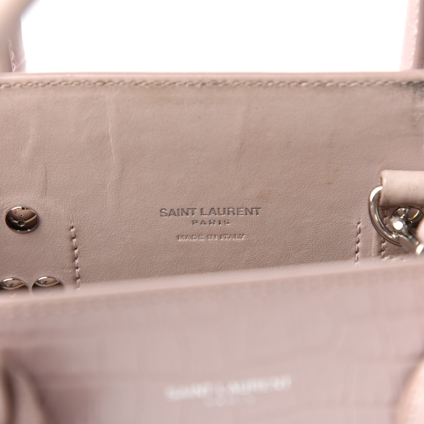 This is an authentic SAINT LAURENT Calfskin Crocodile Embossed Baby Sac De Jour in Rose Antic. This mini tote is crafted of light rose beige crocodile embossed leather and features rolled leather top handles, a long crossbody shoulder strap with polished silver hardware and cinch straps for the expandable sides. The top is open to a smooth matching leather interior with a removable central zipper pocket. Enjoy this lovely bag for all of your day or evening essentials with the classic chic only from Saint Laurent!Follow this item for alerts. Saint Laurent is a registered trademark of Saint Laurent. FASHIONPHILE is not affiliated with Saint Laurent.