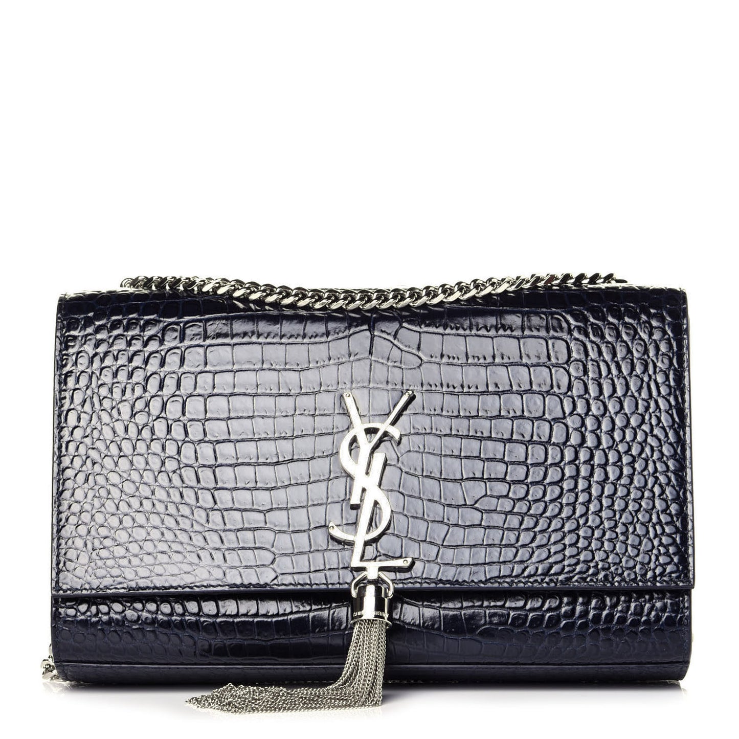 This is an authentic SAINT LAURENT Calfskin Crocodile Embossed Medium Classic Monogram Kate Tassel Satchel in Blue Sapphire. This stunning shoulder bag is crafted of crocodile embossed calfskin in dark blue. The bag features a polished silver chain-link crossbody shoulder strap and a facing flap with a YSL logo with a chain tassel. The flap opens to a black interior with a patch pocket.Follow this item for alerts. Saint Laurent is a registered trademark of Saint Laurent. FASHIONPHILE is not affiliated with Saint Laurent.