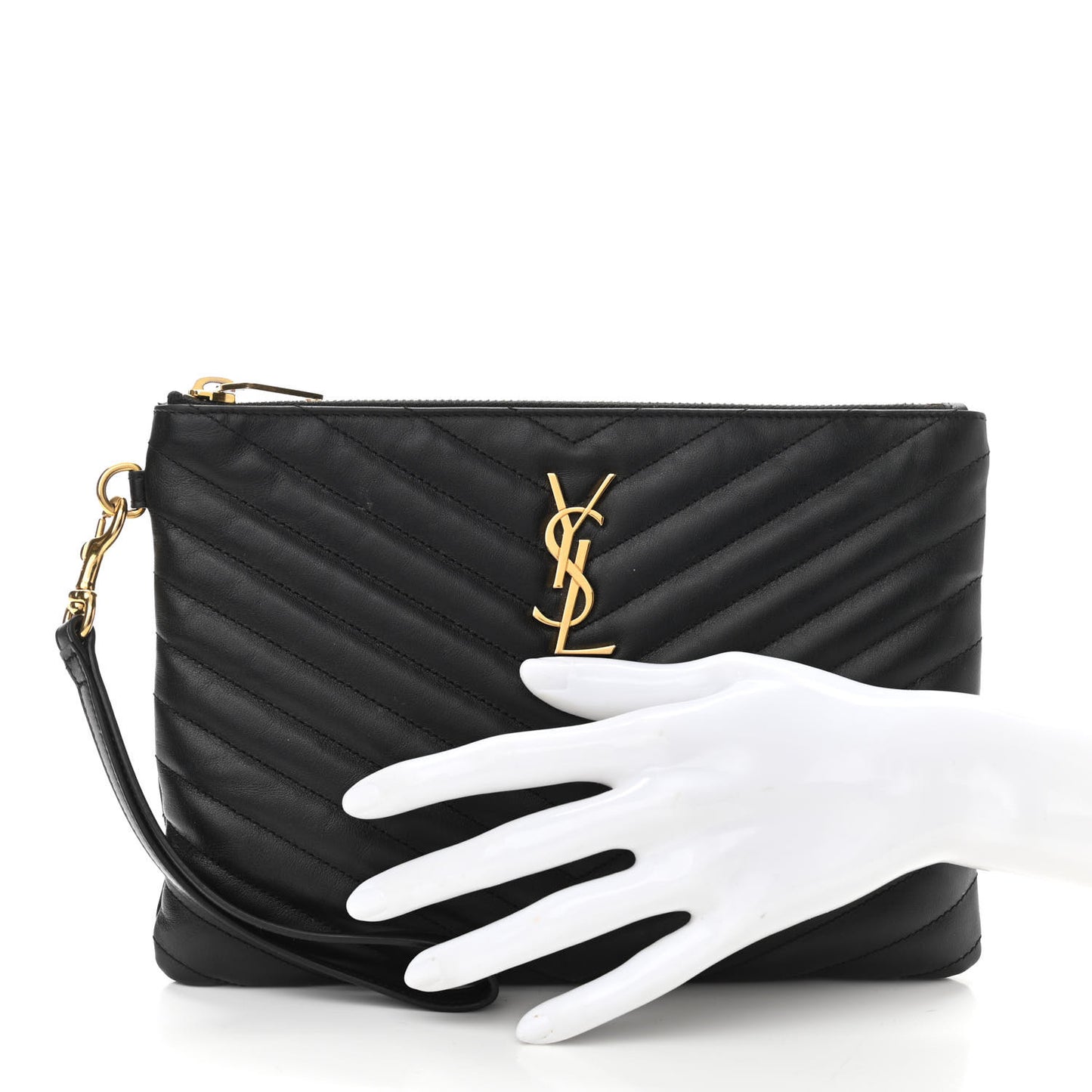 This is an authentic SAINT LAURENT Calfskin Matelasse Chevron Monogram A5 Wristlet in Black. This pouch is crafted of chevron-quilted calfskin leather in black. The pouch features a gold YSL logo on the front and a removable wristlet strap. The top zipper opens to a black fabric interior with a patch pocket and card slots.Follow this item for alerts. Saint Laurent is a registered trademark of Saint Laurent. FASHIONPHILE is not affiliated with Saint Laurent.