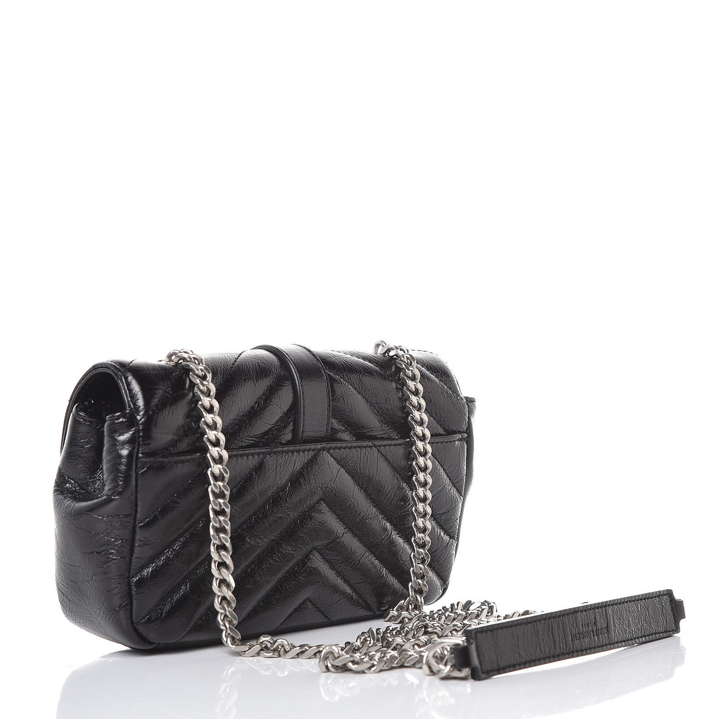 This is an authentic SAINT LAURENT Calfskin Matelassé Monogram Classic Baby Punk Chain Bag in Black. This elegant mini shoulder bag is crafted of calfskin with a chevron quilting in glossy black. The bag features an aged silver chain link shoulder strap with a shoulder pad and a facing V- shaped flap with a prominent aged silver YSL logo, padlock and skeleton charm. The flap opens to a black fabric interior with leather card slots. This bag is ideal for daytime or evening wear with the classic chic of Saint Laurent!Follow this item for alerts. Saint Laurent is a registered trademark of Saint Laurent. FASHIONPHILE is not affiliated with Saint Laurent.
