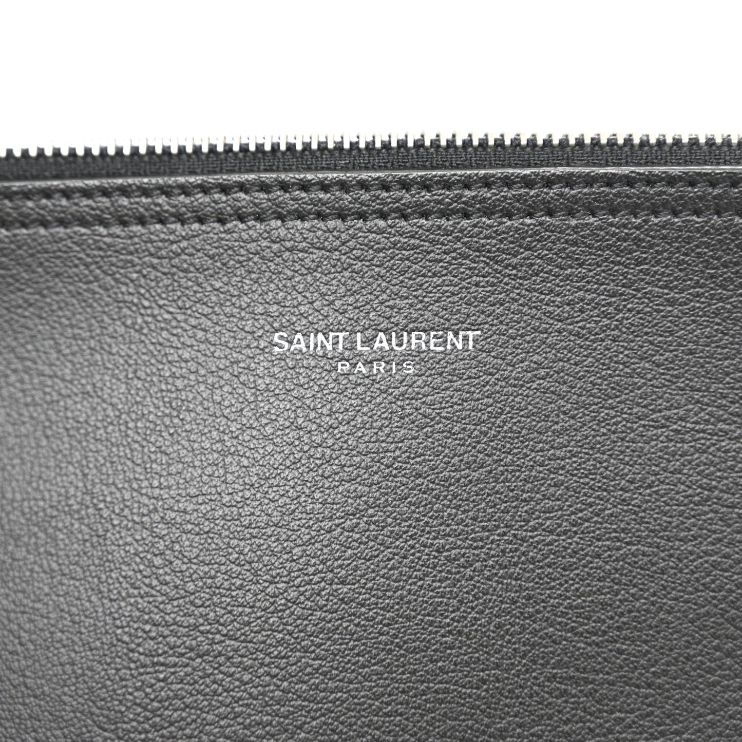 This is an authentic SAINT LAURENT SAINT Calfskin Medium Shopping Tote in Black. This chic tote is crafted of supple calfskin leather in black. The shoulder bag features strap top handles attached to a wide open top revealing a black suede leather interior with a matching removable pouch.Follow this item for alerts. Saint Laurent is a registered trademark of Saint Laurent. FASHIONPHILE is not affiliated with Saint Laurent.