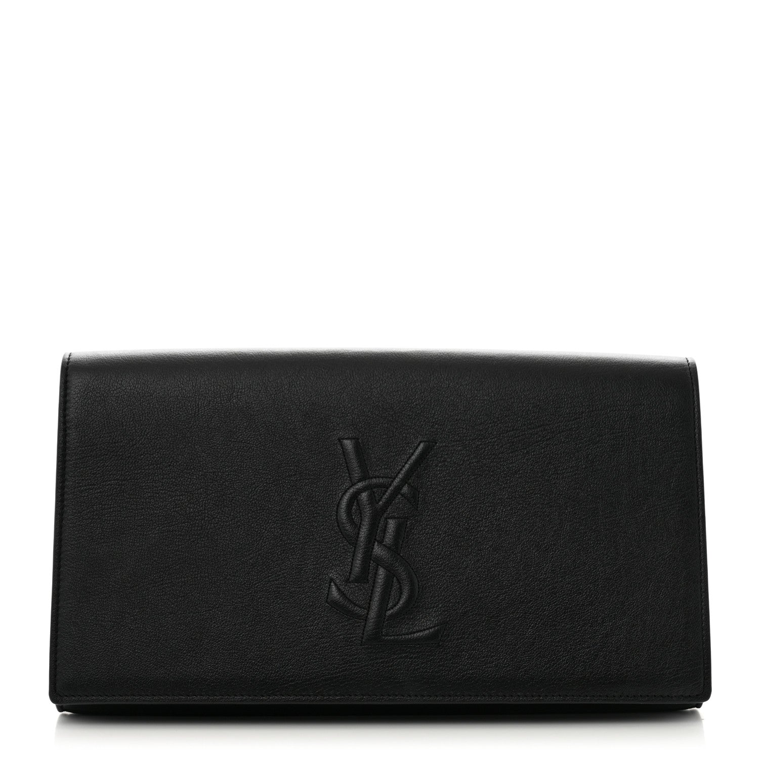 This is an authentic SAINT LAURENT Calfskin Monogram Large Belle De Jour Clutch in Black. This chic clutch is crafted of calfskin leather in black, with a classic YSL logo stitched on the crossover flap. The bag opens with a magnetic snap to a black satin fabric interior with a patch pocket.Follow this item for alerts. Saint Laurent is a registered trademark of Saint Laurent. FASHIONPHILE is not affiliated with Saint Laurent.
