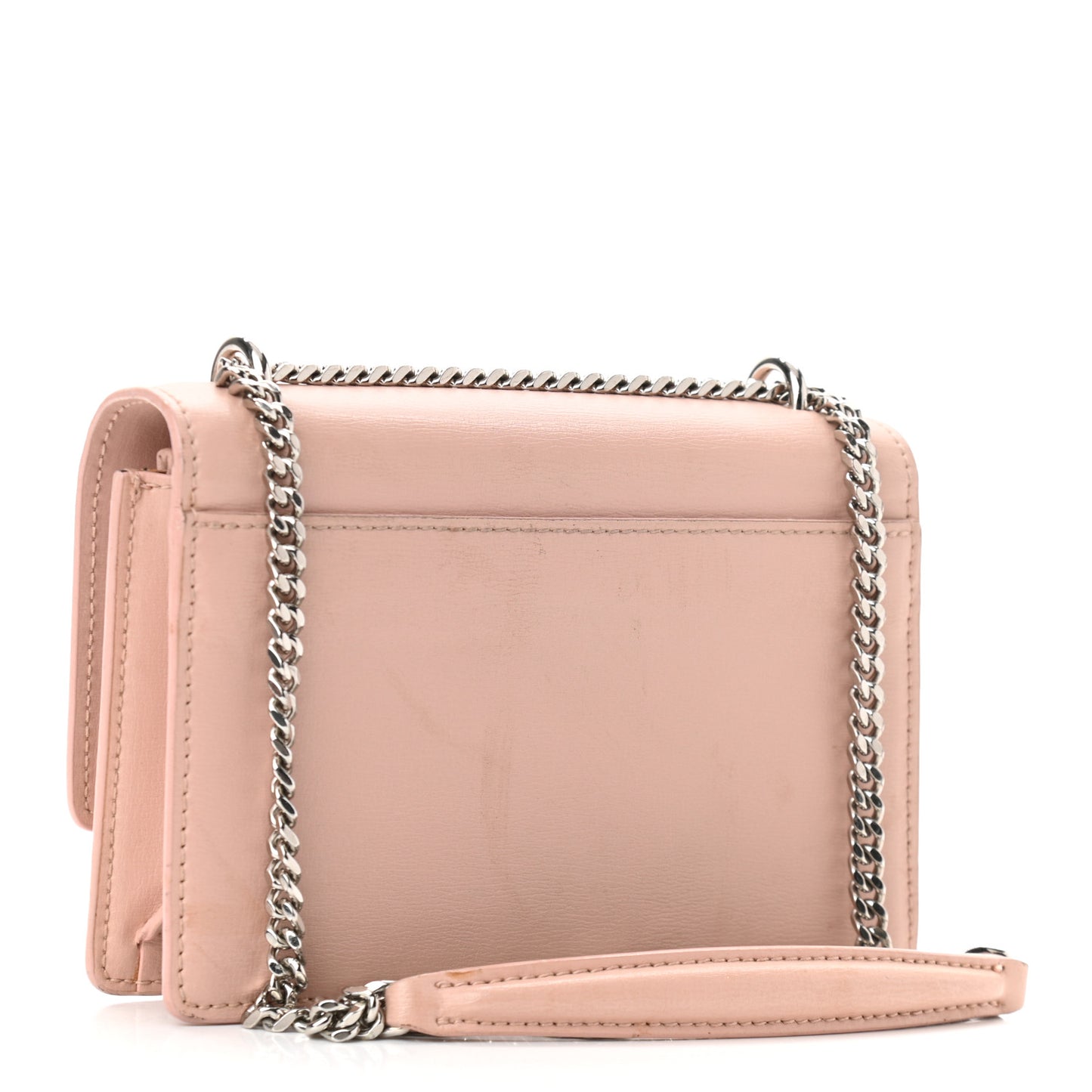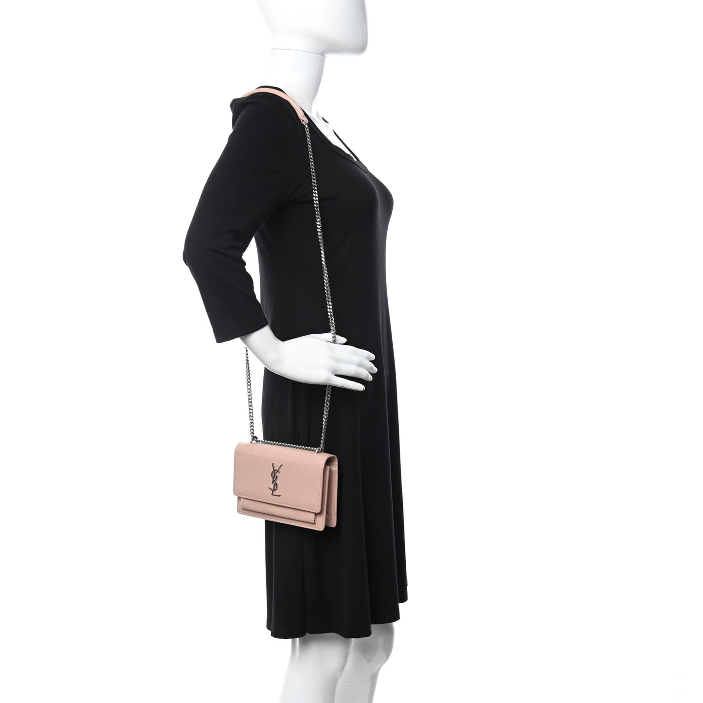 This is an authentic SAINT LAURENT Calfskin Monogram Sunset Chain Wallet in Light Pink. This stunning shoulder bag is crafted of calfskin leather in pink. The bag features a silver chain, a front facing flap with a signature YSL logo. This fold over bag is complete with magnetic snap that opens to a matching beige leather interior with a zipper compartment, patch pockets and card slots.Follow this item for alerts. Saint Laurent is a registered trademark of Saint Laurent. FASHIONPHILE is not affiliated with Saint Laurent.
