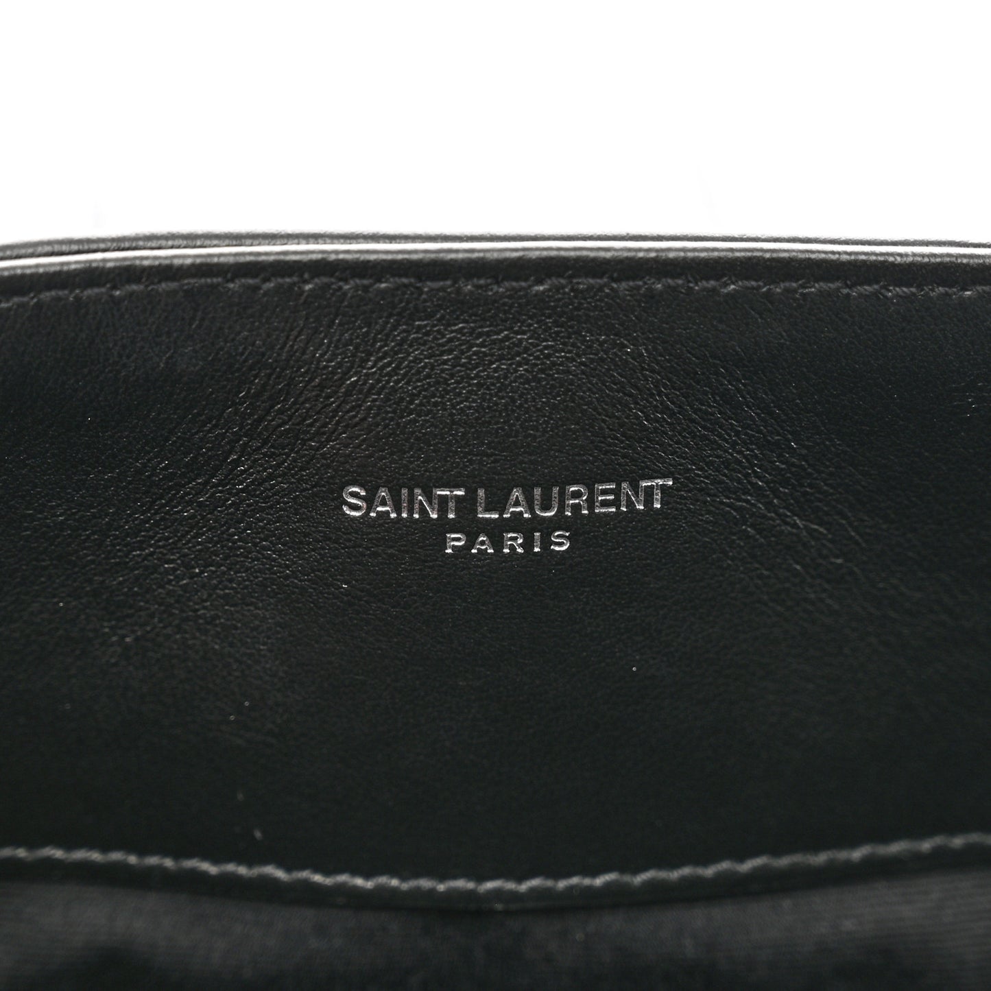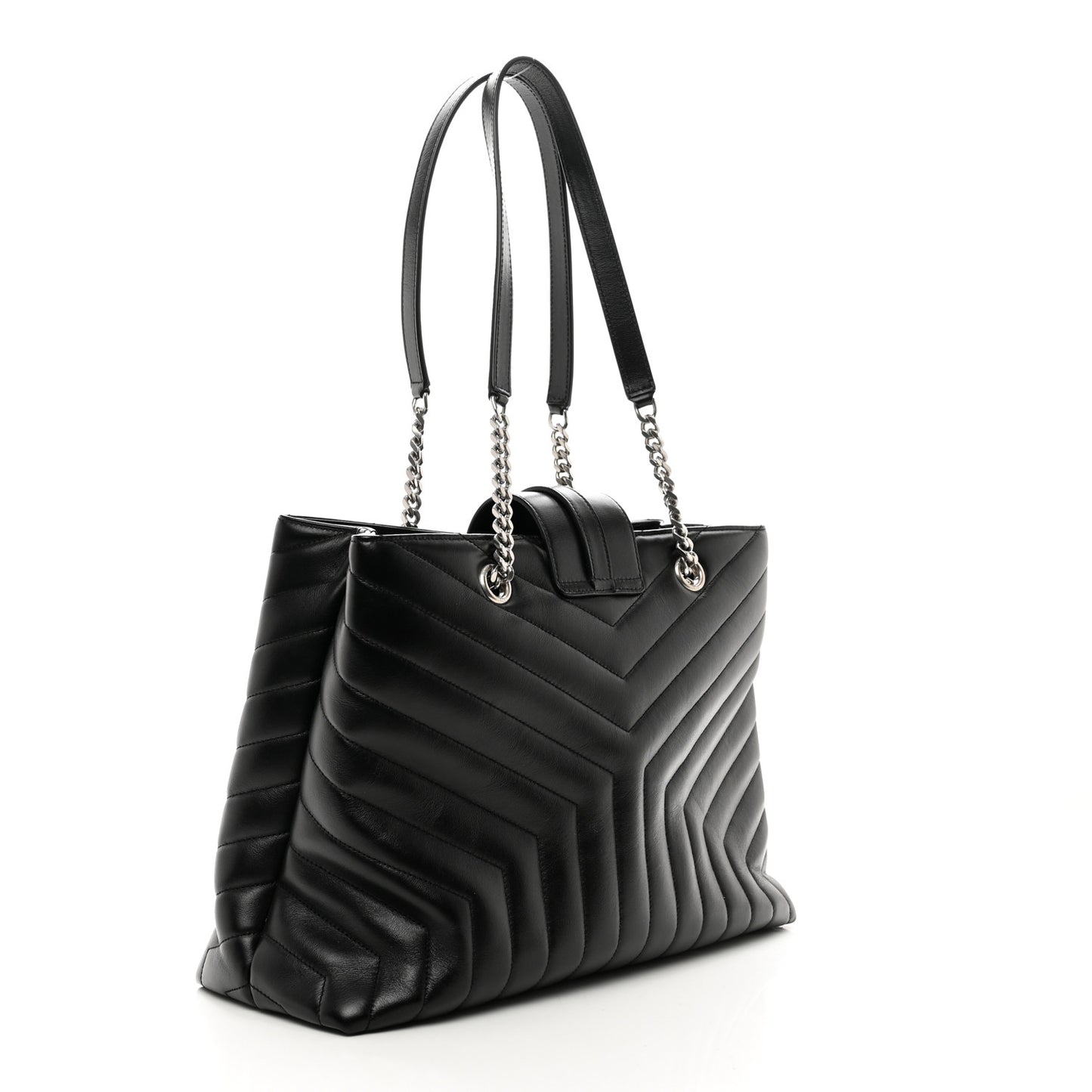 This is an authentic SAINT LAURENT Calfskin Y Quilted Monogram Large Loulou Shopper in Black. This stylish shoulder bag is crafted of chevron quilted calfskin leather in black. The bag features leather shoulder straps with silver chain links and a cross over strap with a silver YSL logo. The flap opens to a black fabric interior with a central zipper pocket and zipper and patch pockets on the sides.Follow this item for alerts. Saint Laurent is a registered trademark of Saint Laurent. FASHIONPHILE is not affiliated with Saint Laurent.