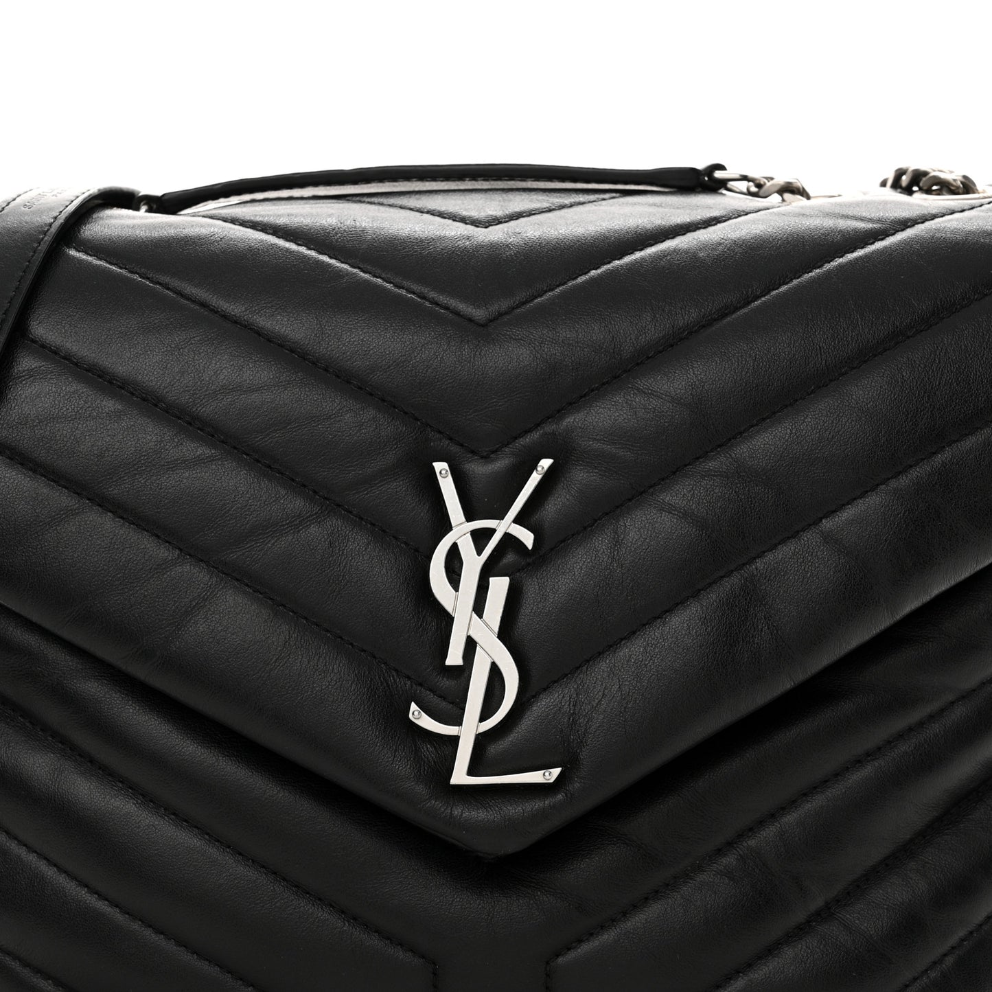 This is an authentic SAINT LAURENT Calfskin Y Quilted Monogram Medium Loulou Chain Satchel in Black. This elegant shoulder tote features chevron quilted calfskin leather in black. The bag has silver chain link shoulder straps with black leather shoulder pads. The envelope-style crossover flap features a prominent silver YSL monogram detail and snaps open to a partitioned black fabric interior with zipper pockets.Follow this item for alerts. Saint Laurent is a registered trademark of Saint Laurent. FASHIONPHILE is not affiliated with Saint Laurent.