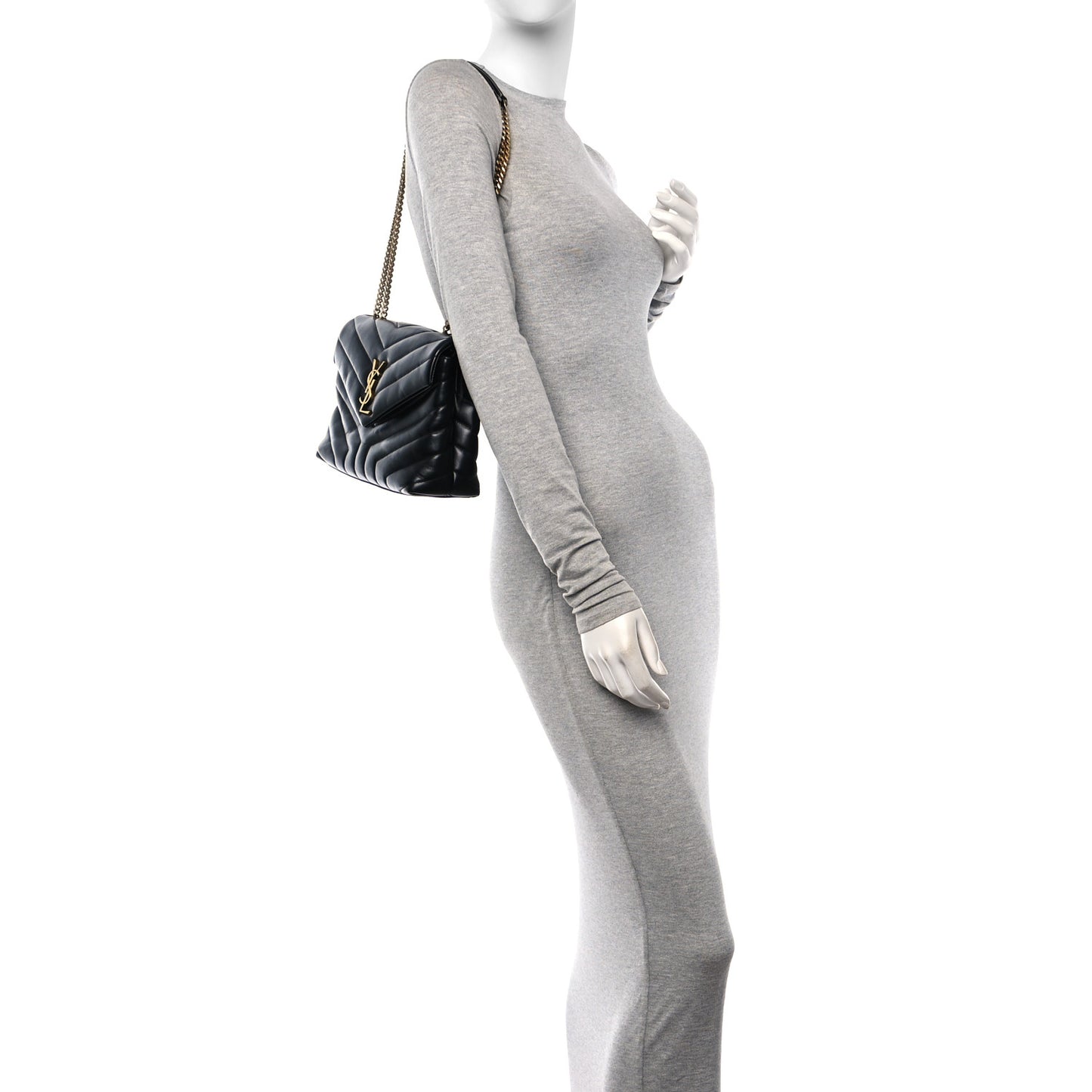 This is an authentic SAINT LAURENT Calfskin Y Quilted Monogram Small Loulou Chain Satchel in Black. This elegant shoulder bag is crafted of chevron-quilted calfskin leather. The bag features a gold chain link shoulder strap with shoulder pads, and a gold YSL detail on the crossover flap. The bag opens to a partitioned black fabric interior with zipper and patch pockets.Follow this item for alerts. Saint Laurent is a registered trademark of Saint Laurent. FASHIONPHILE is not affiliated with Saint Laurent.