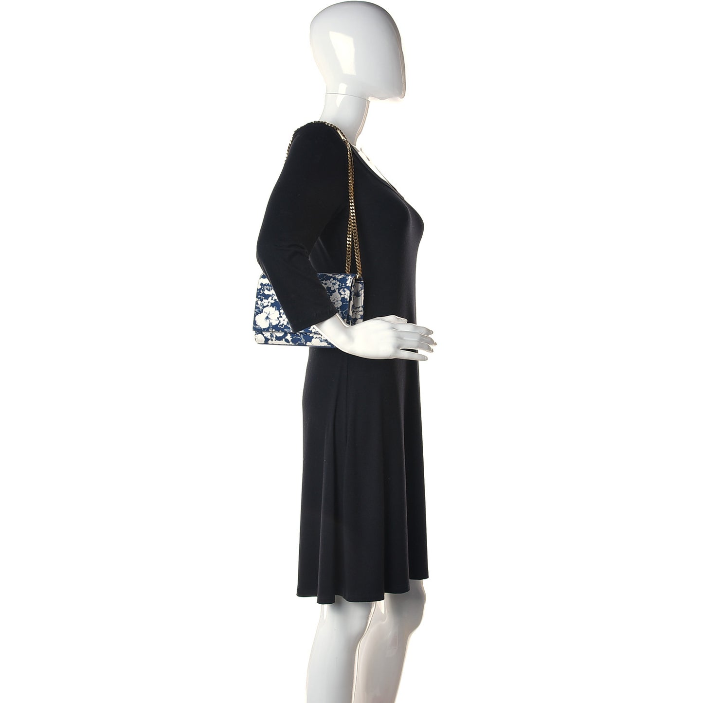 This is an authentic SAINT LAURENT Canvas Small Monogram Hibiscus Print Kate Satchel in Blue. This stylish baguette is crafted of blue canvas with a white floral print and a classic bold brass YSL facing logo. The bag features a gold bijoux below-the-waist cross-body shoulder strap and a full facing flap. The flap opens to a black fabric interior with a pocket.