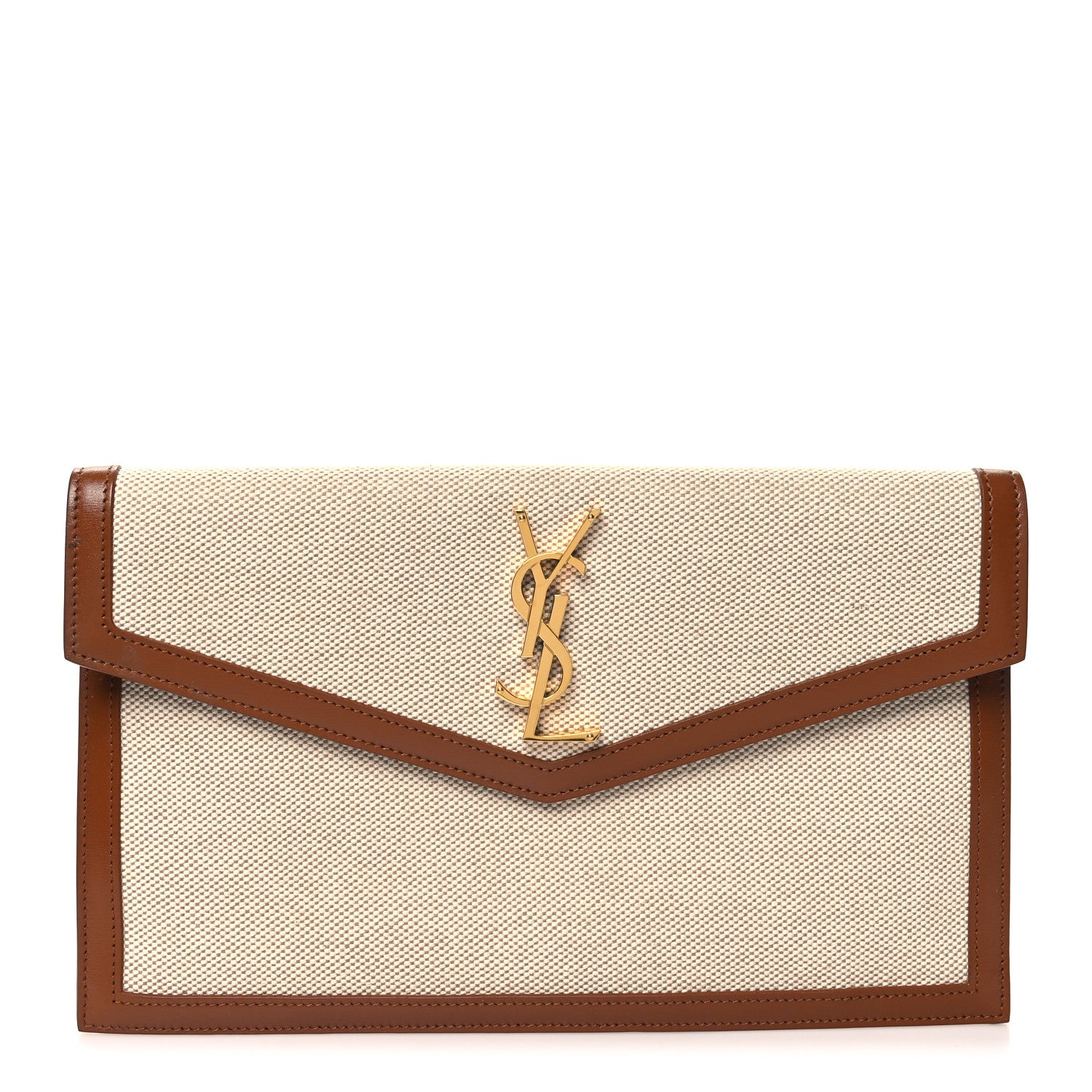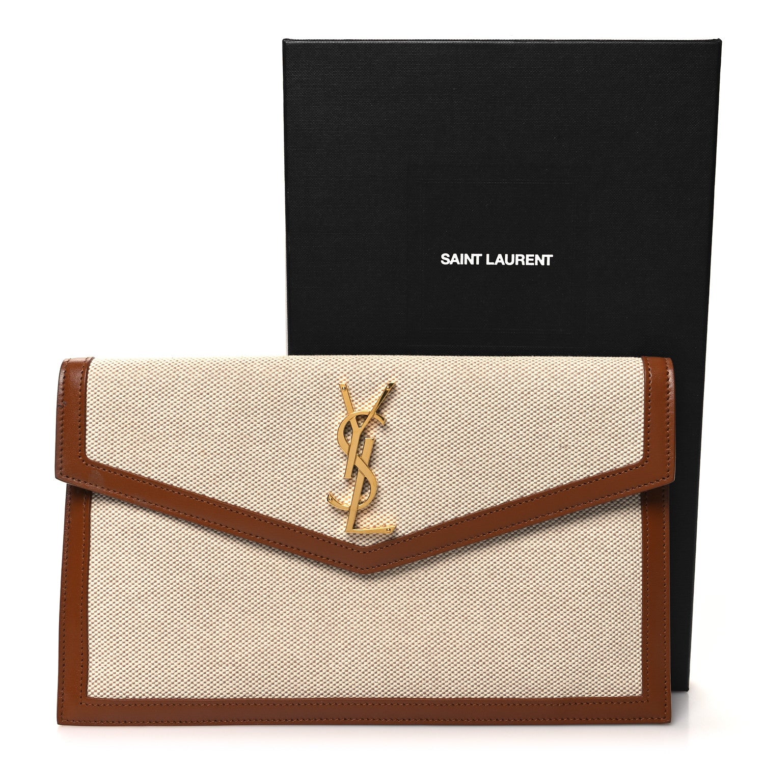 This is an authentic SAINT LAURENT Canvas Uptown Pouch Natural in Beige and Brick. This clutch is crafted of durable beige canvas with brown leather trim and features a facing V shaped flap with a prominent gold YSL logo. The magnetic flap opens to a simple black fabric interior.Follow this item for alerts. Saint Laurent is a registered trademark of Saint Laurent. FASHIONPHILE is not affiliated with Saint Laurent.