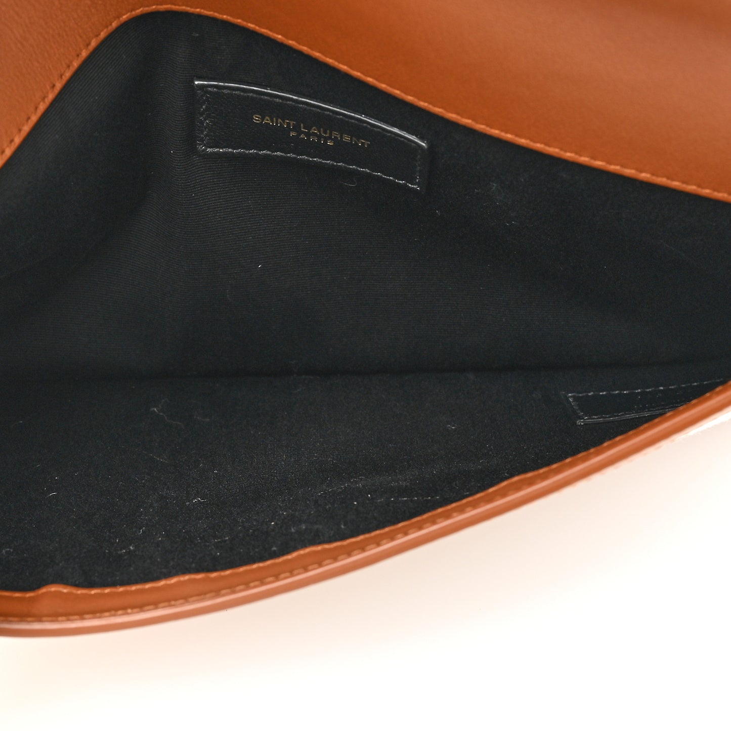 This is an authentic SAINT LAURENT Canvas Uptown Pouch Natural in Beige and Brick. This clutch is crafted of durable beige canvas with brown leather trim and features a facing V shaped flap with a prominent gold YSL logo. The magnetic flap opens to a simple black fabric interior.