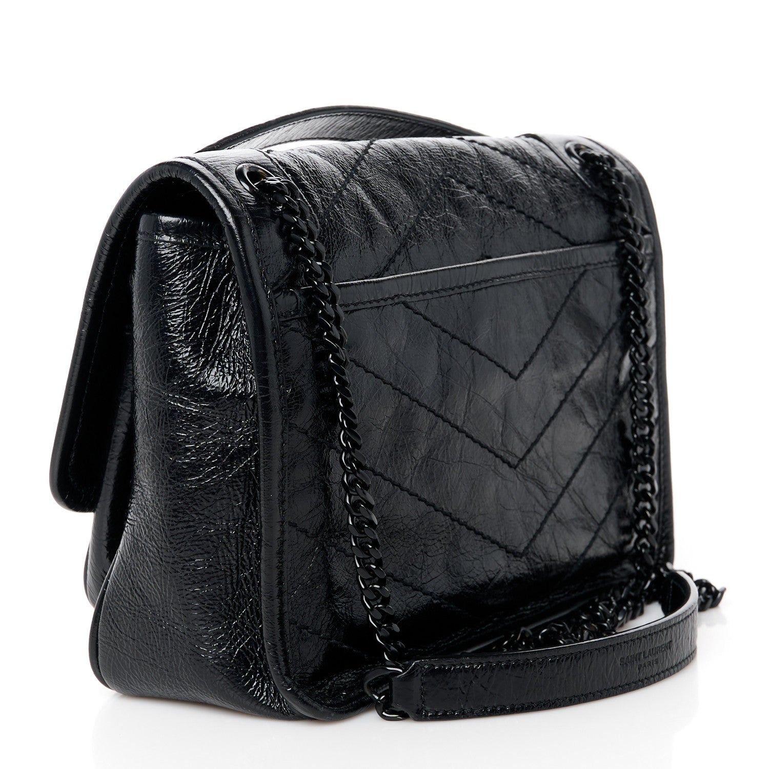 This is an authentic SAINT LAURENT Crinkled Calfskin Matelasse Monogram Baby Niki Chain Satchel in Black. This elegant shoulder bag is crafted of chevron-quilted calfskin leather in black. The bag features black chain-link shoulder straps with matching leather shoulder pads and a rear patch pocket with magnetic closure. The front flap features a black leather-covered YSL monogram detail and opens with a magnetic snap to a black fabric interior with pockets.Follow this item for alerts. Saint Laurent is a registered trademark of Saint Laurent. FASHIONPHILE is not affiliated with Saint Laurent.