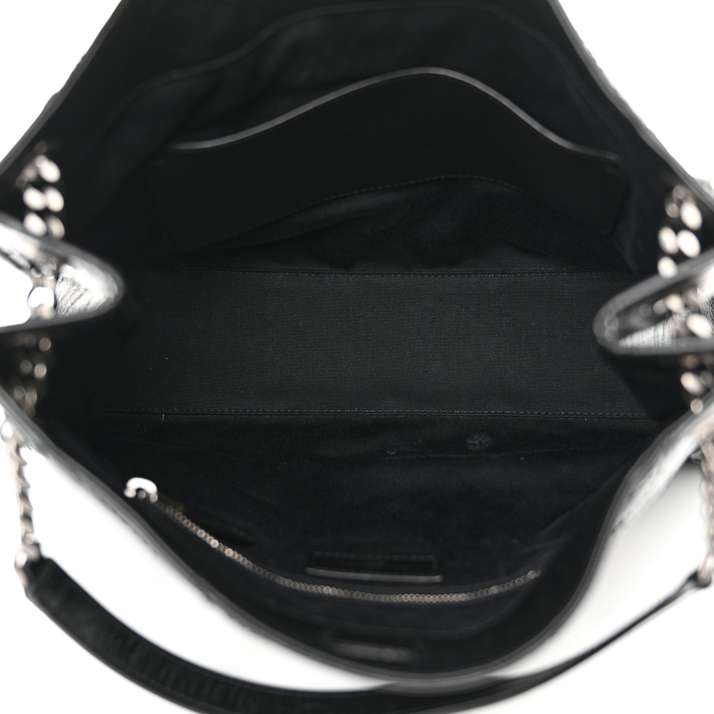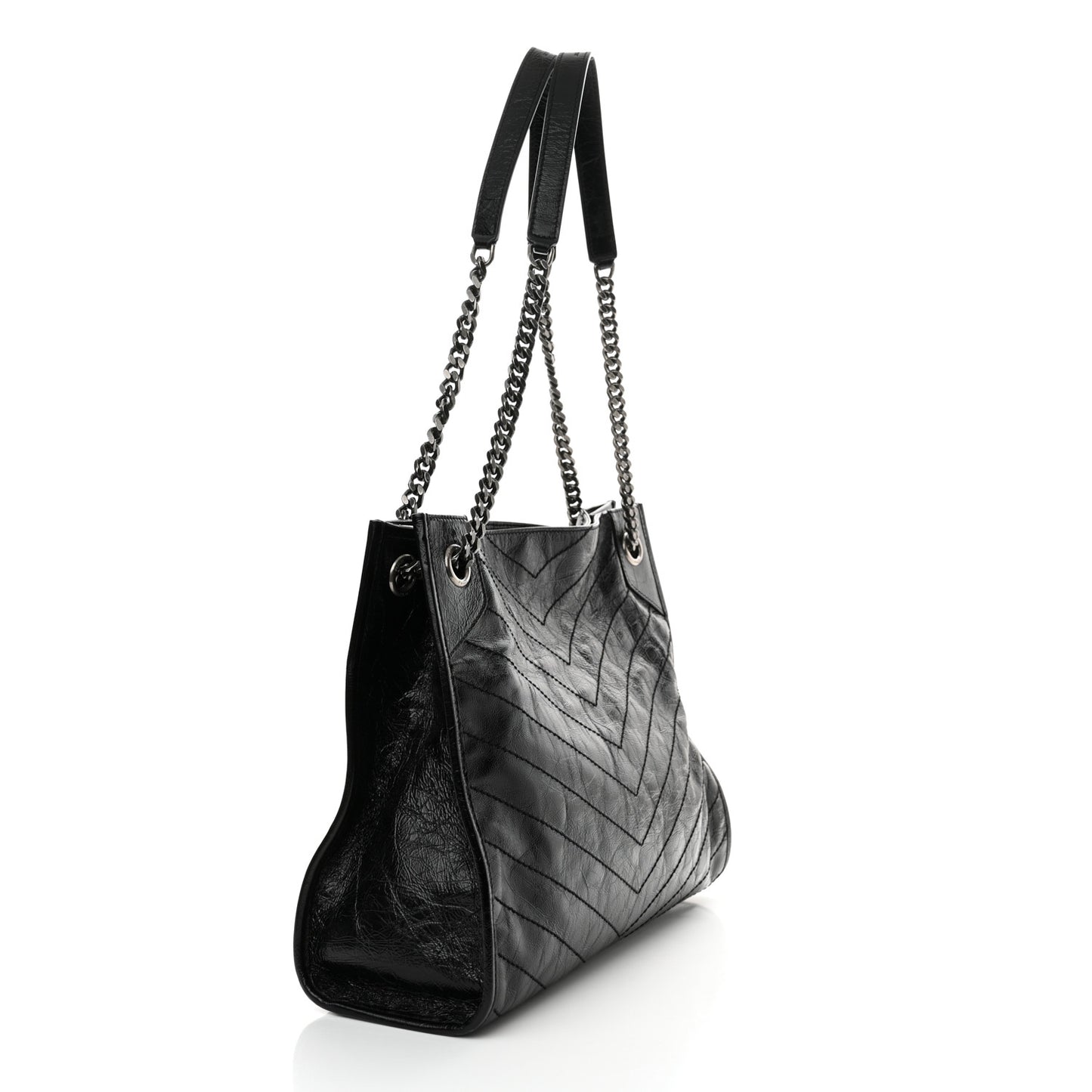 This is an authentic SAINT LAURENT Crinkled Calfskin Matelasse Monogram Medium Niki Shopper Tote in Black. This shoulder bag features crinkled chevron quilting. The bag features an aged silver chain link shoulder strap with a matching leather shoulder pad. The top opens to a black fabric interior with zipper and patch pockets.Follow this item for alerts. Saint Laurent is a registered trademark of Saint Laurent. FASHIONPHILE is not affiliated with Saint Laurent.