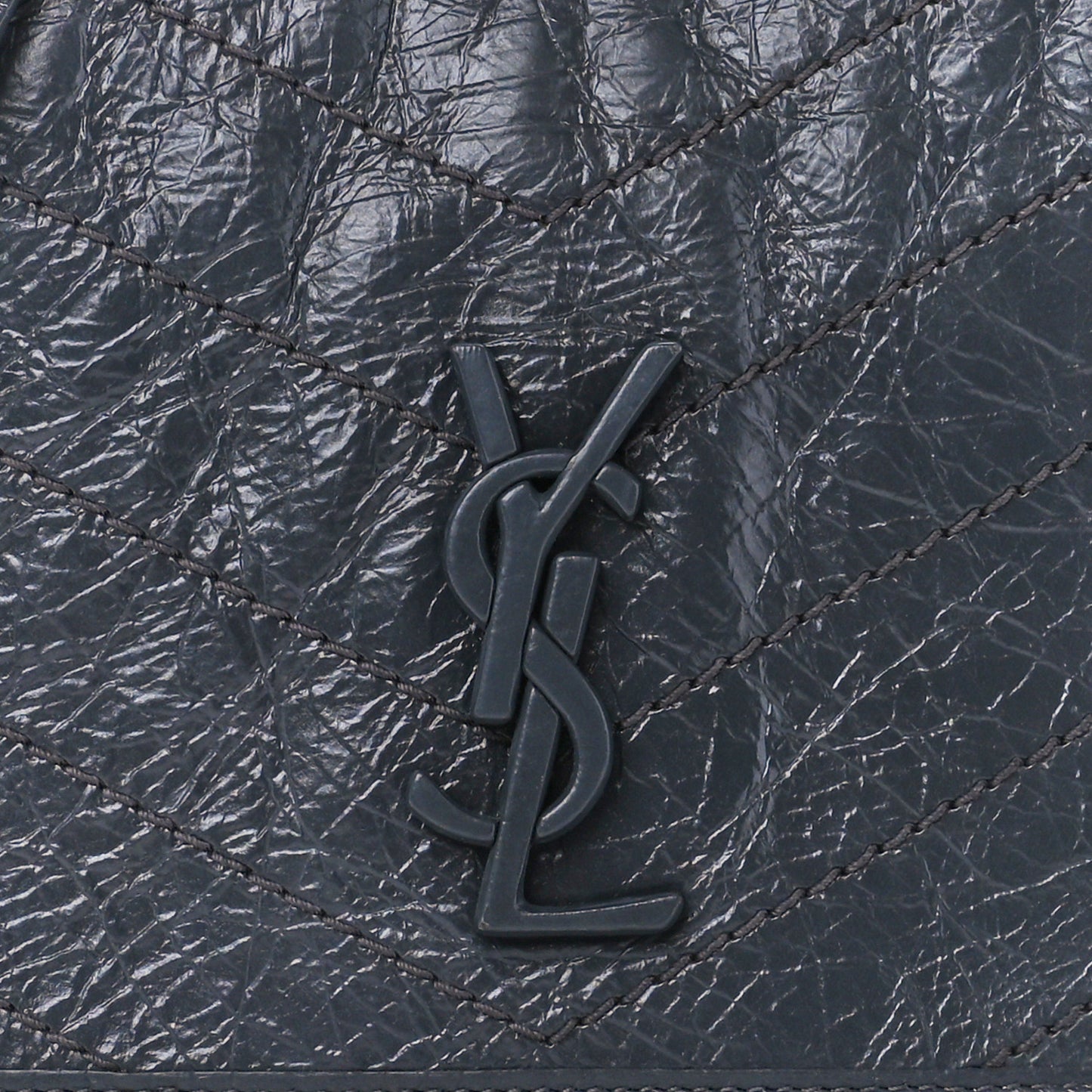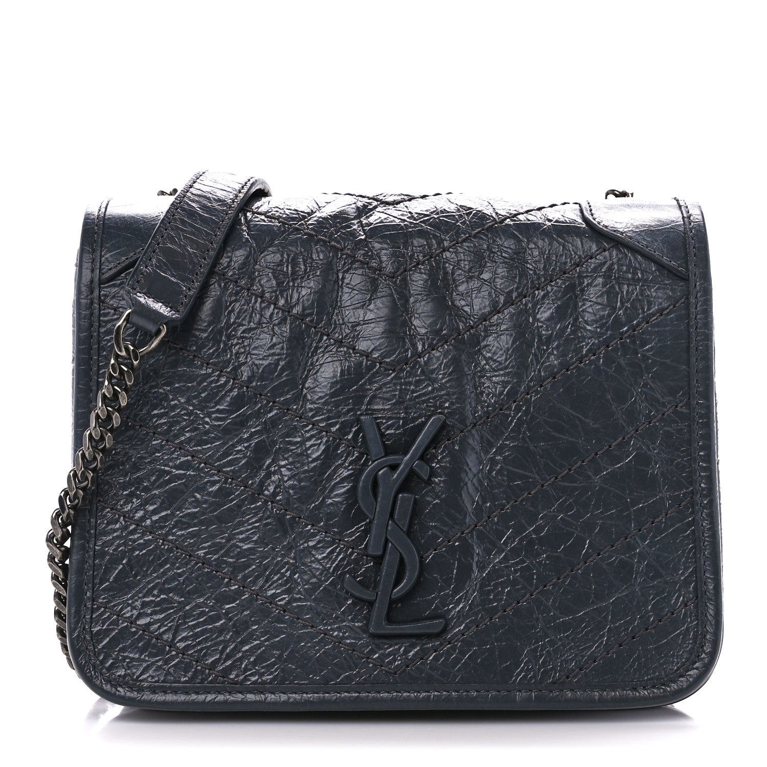 This is an authentic SAINT LAURENT Crinkled Calfskin Matelasse Monogram Niki Chain Wallet in Fog. This elegant chain wallet is crafted of crinkled chevron quilted calfskin leather in dark grey. The shoulder bag features a rear flat pocket, an aged silver chain link shoulder strap with a black leather shoulder pad, and a prominent grey YSL monogram detail on the crossover flap. The bag opens with a magnetic snap to a black fabric interior with a zipper pocket and leather card slots.Follow this item for alerts. Saint Laurent is a registered trademark of Saint Laurent. FASHIONPHILE is not affiliated with Saint Laurent.