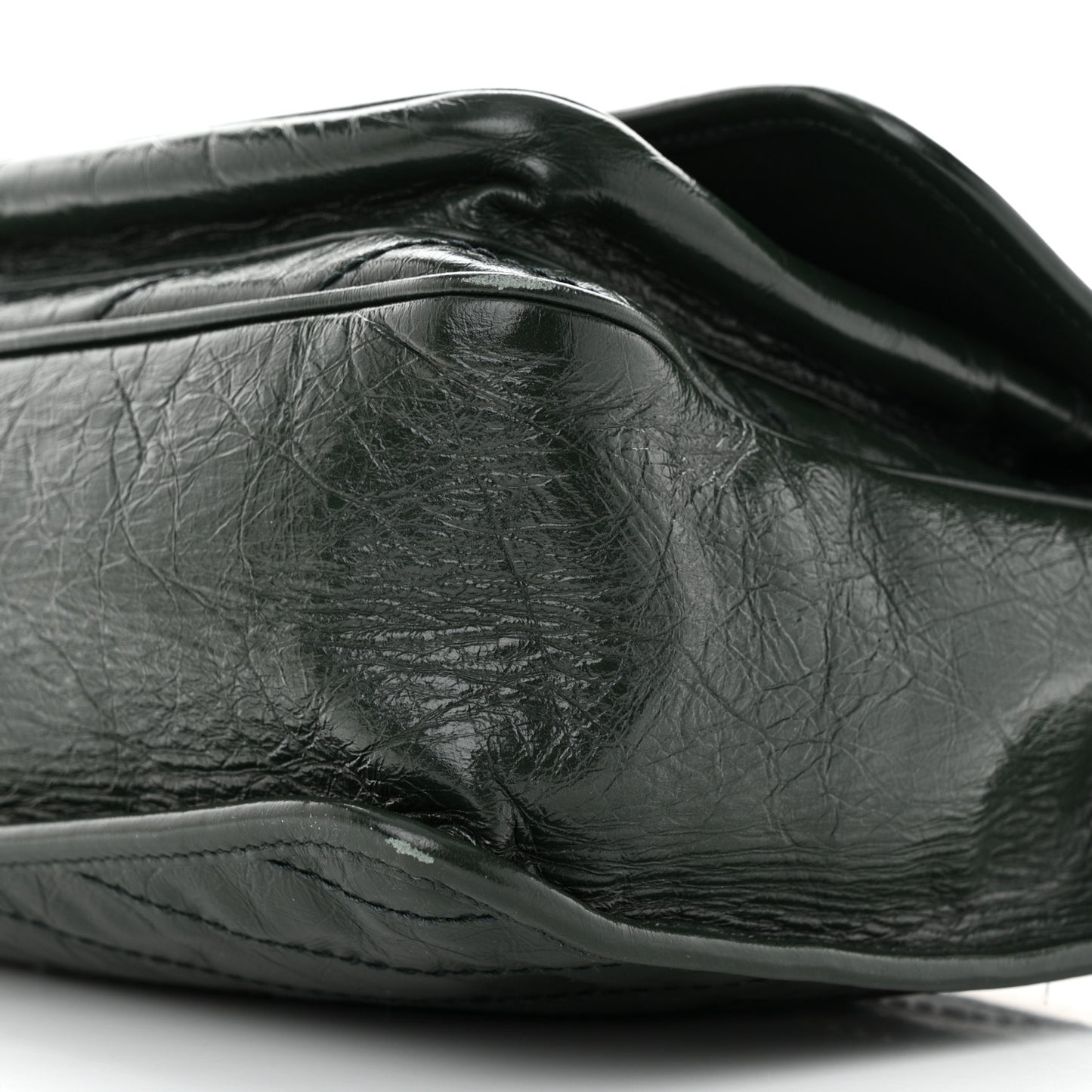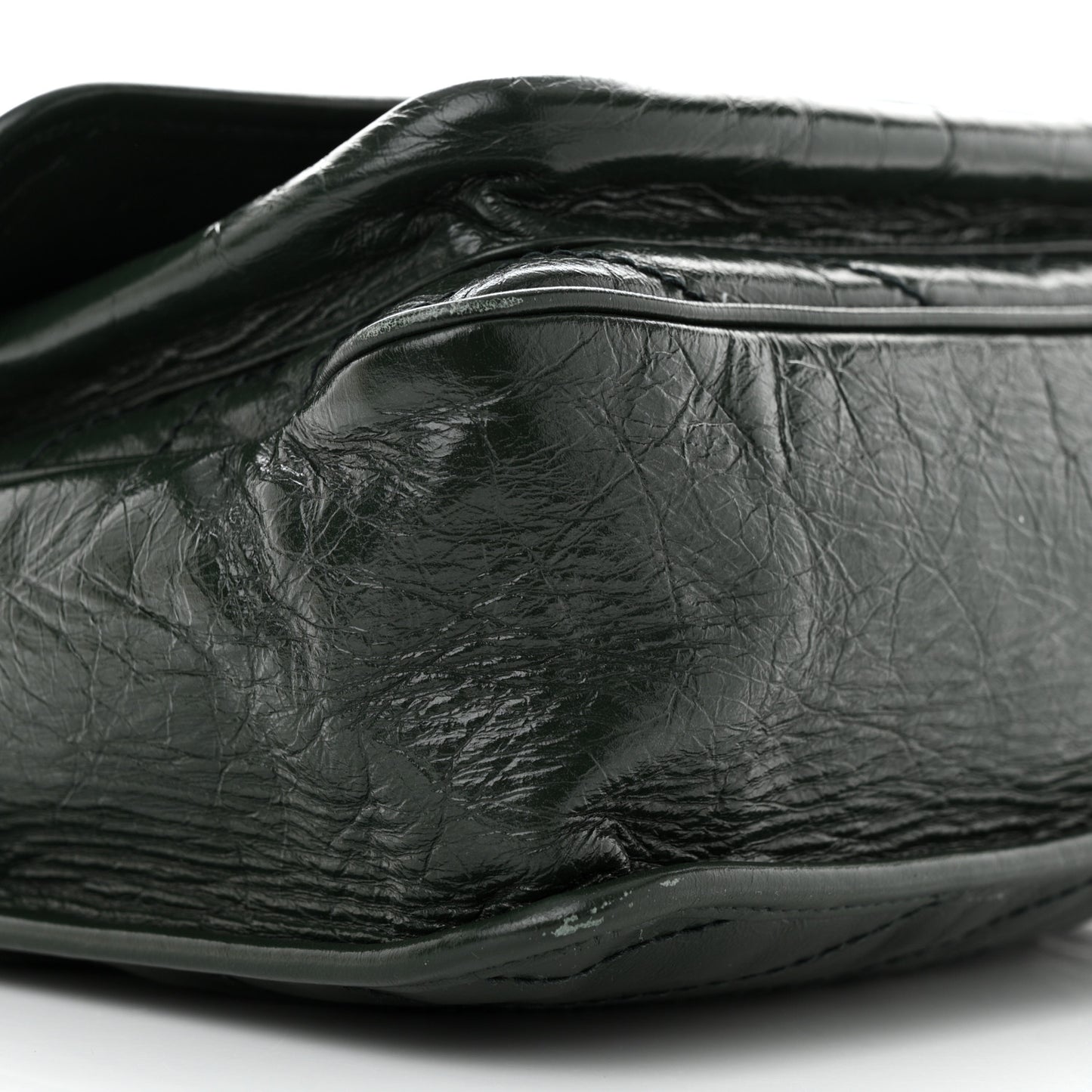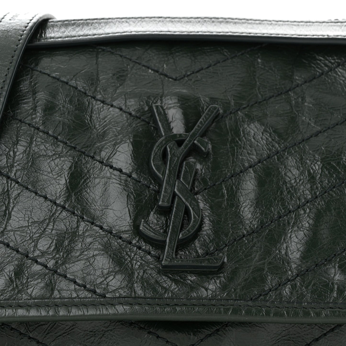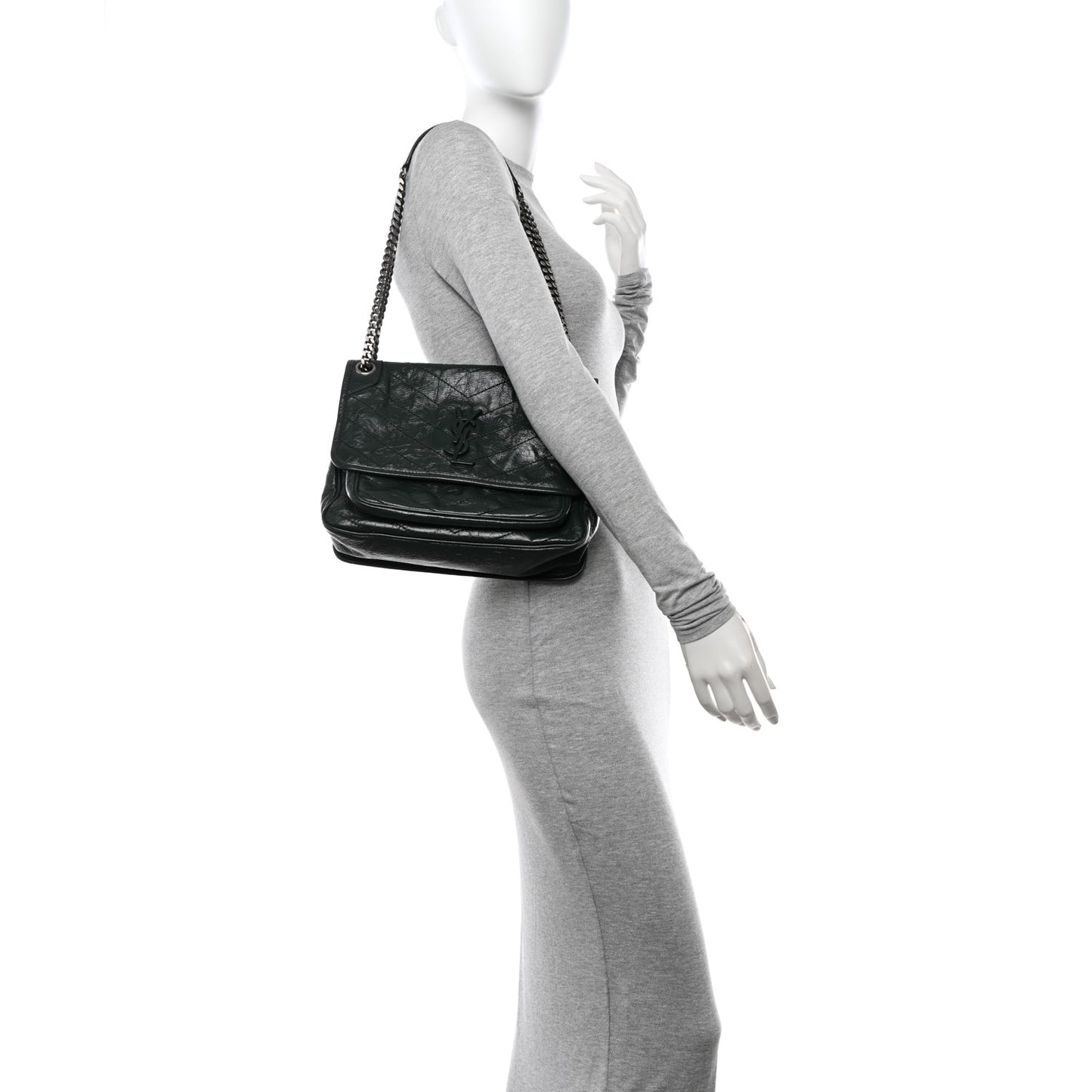 This is an authentic SAINT LAURENT Crinkled Lambskin Matelasse Monogram Medium Niki Chain Satchel in Green. This elegant shoulder tote features crinkled chevron quilting at both the front and the back, with crinkled leather sides. The bag features aged silver chain link shoulder straps with matching leather shoulder pads. The front flap features a prominent matte green leather YSL monogram detail and opens to a partitioned fabric interior with zippered and patch pockets.Follow this item for alerts. Saint Laurent is a registered trademark of Saint Laurent. FASHIONPHILE is not affiliated with Saint Laurent.