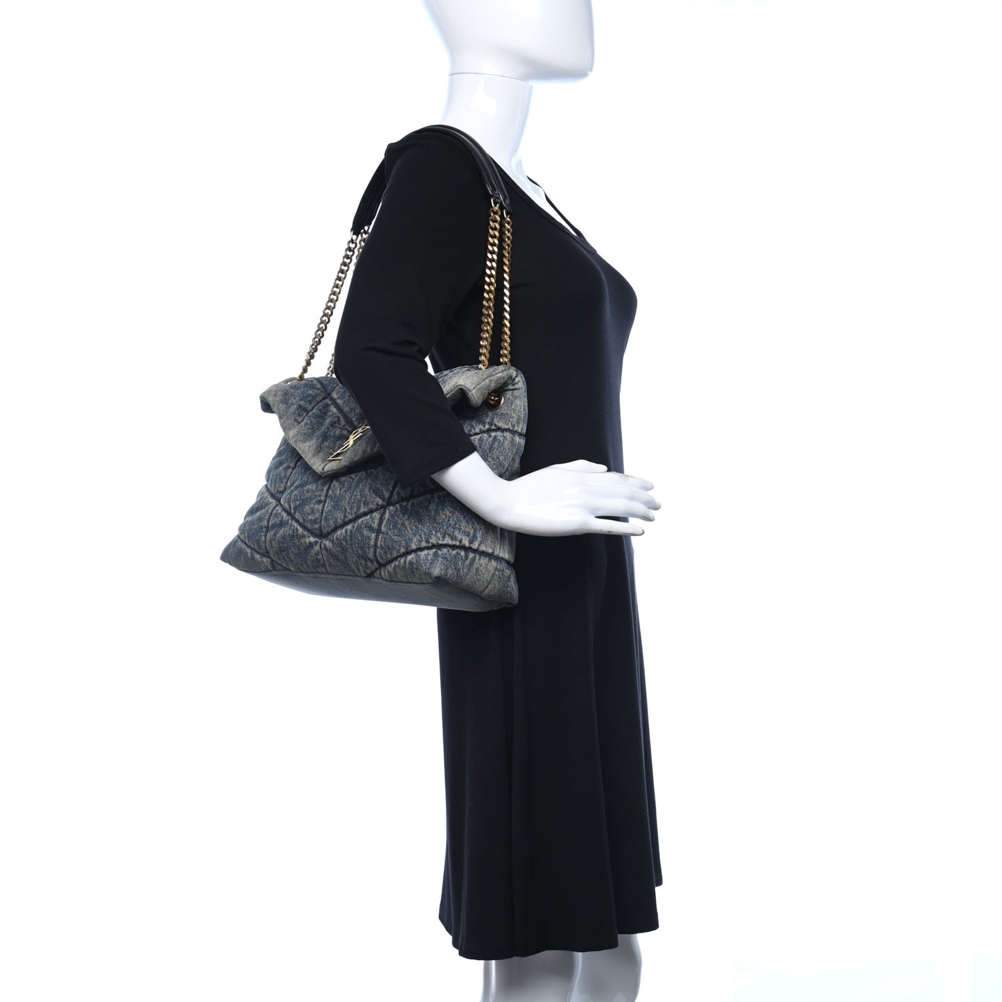 This is an authentic SAINT LAURENT Denim Quilted Medium Loulou Puffer Monogram Chain Satchel in Blue and Black. This elegant shoulder tote features chic quilted denim. The bag has aged gold chain-link shoulder straps with black leather shoulder pads. The front flap features a prominent YSL monogram detail and opens to a black fabric interior with a zippered pocket.Follow this item for alerts. Saint Laurent is a registered trademark of Saint Laurent. FASHIONPHILE is not affiliated with Saint Laurent.