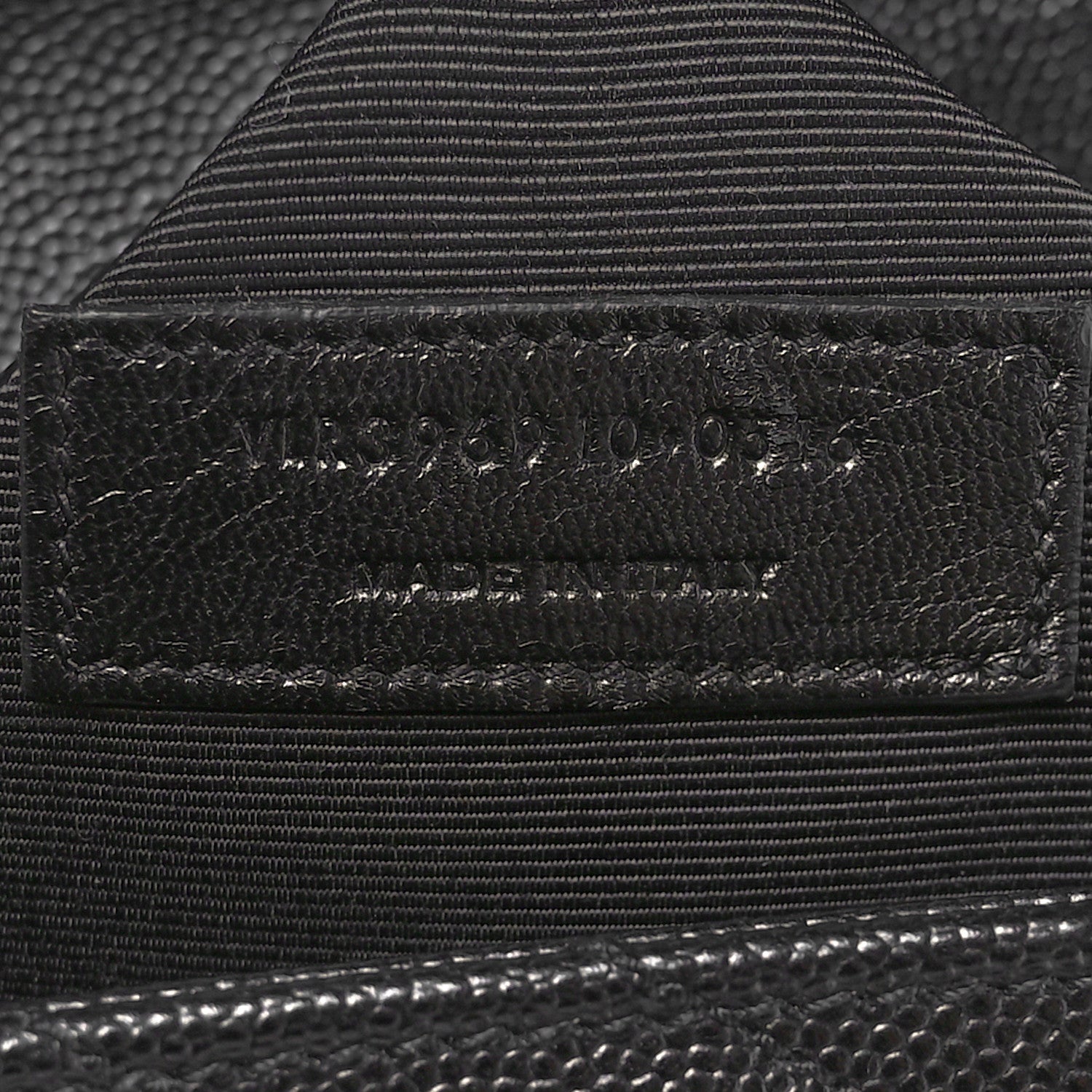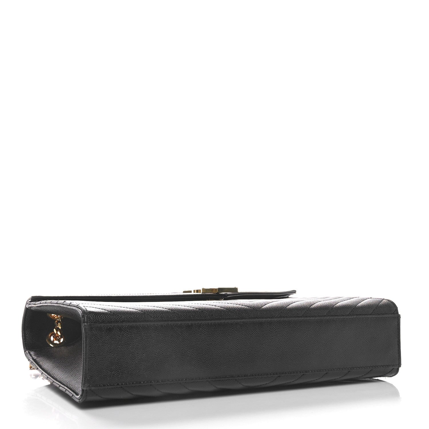 This is an authentic SAINT LAURENT Grain De Poudre Matelasse Chevron Large Monogram Satchel in Black. This elegant shoulder bag is crafted of beautifully pebbled calfskin leather in black. The bag features polished gold hardware, chevron quilting, chain shoulder straps and a gold YSL emblem on the front flap. The flap opens to a black fabric interior with a zipper pocket.Follow this item for alerts. Saint Laurent is a registered trademark of Saint Laurent. FASHIONPHILE is not affiliated with Saint Laurent.