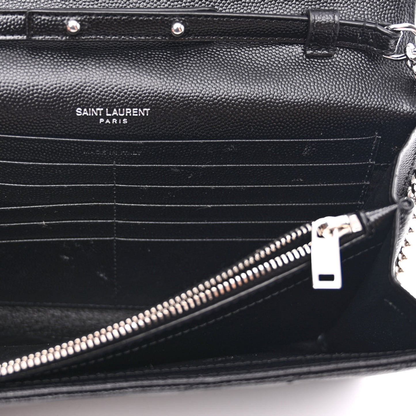 This is an authentic SAINT LAURENT Grain De Poudre Matelasse Chevron Monogram Chain Wallet in Black. This elegant wallet on a chain is crafted of finely pebbled calfskin leather in black with chevron quilting. The bag features a removable silver chain strap and a classic YSL emblem on the front. The flap opens with a magnetic snap to a black leather interior with card slots, patch pockets, and a zipper compartment.Follow this item for alerts. Saint Laurent is a registered trademark of Saint Laurent. FASHIONPHILE is not affiliated with Saint Laurent.