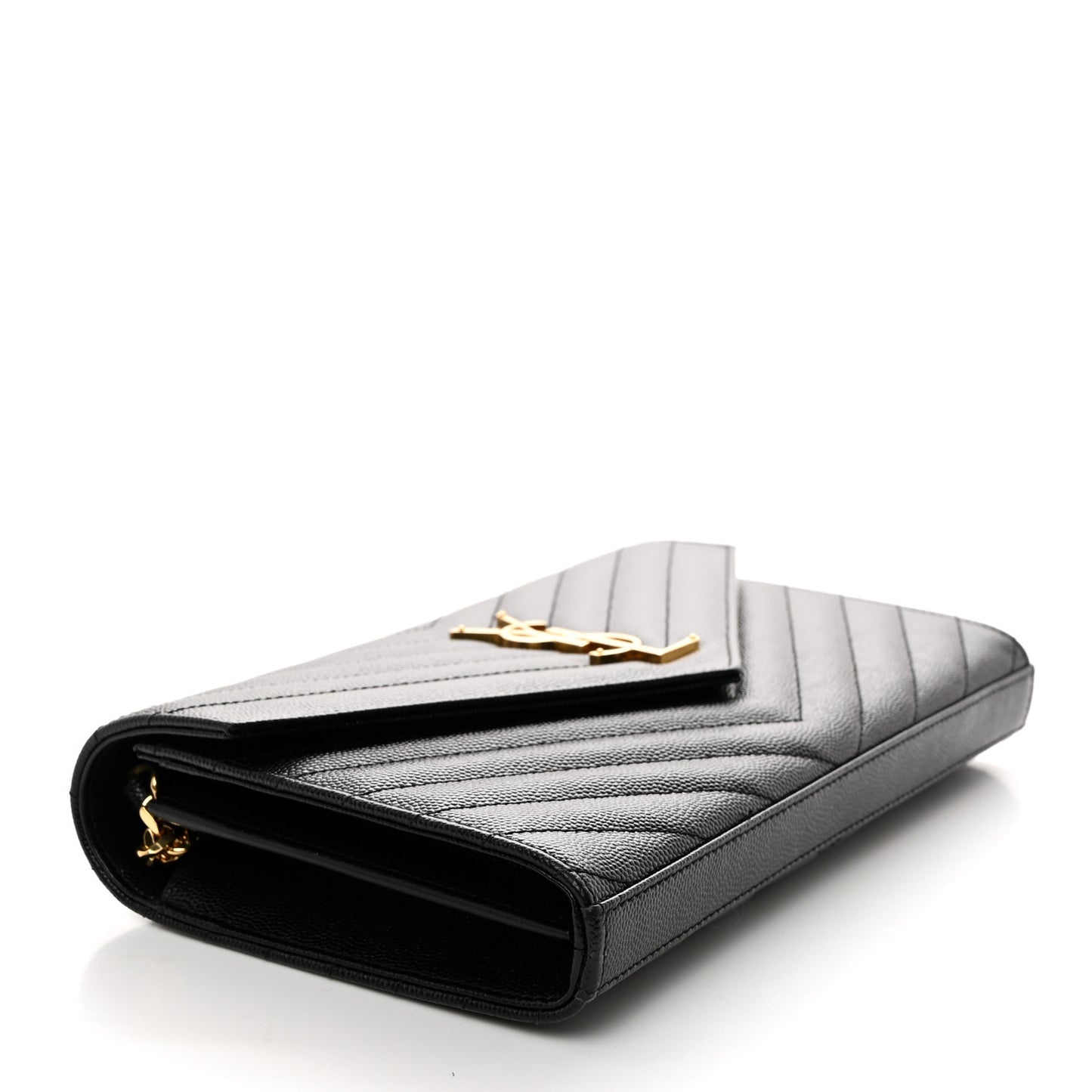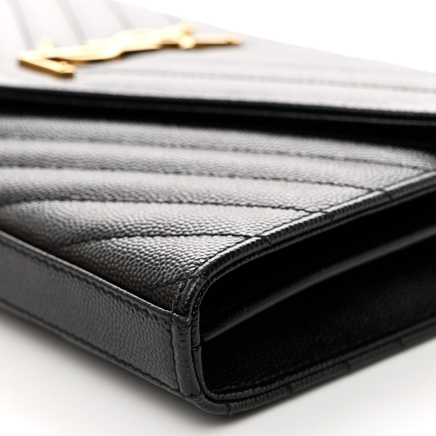 This is an authentic SAINT LAURENT Grain De Poudre Matelasse Chevron Monogram Chain Wallet in Black. This elegant wallet on a chain is crafted of finely pebbled chevron quilted leather in black. The shoulder bag features a removable waist-length bijoux gold chain shoulder strap with a shoulder pad and a classic YSL emblem on the flap. This opens to a black leather interior with card slots, a zipper compartment, and a pocket.Follow this item for alerts. Saint Laurent is a registered trademark of Saint Laurent. FASHIONPHILE is not affiliated with Saint Laurent.