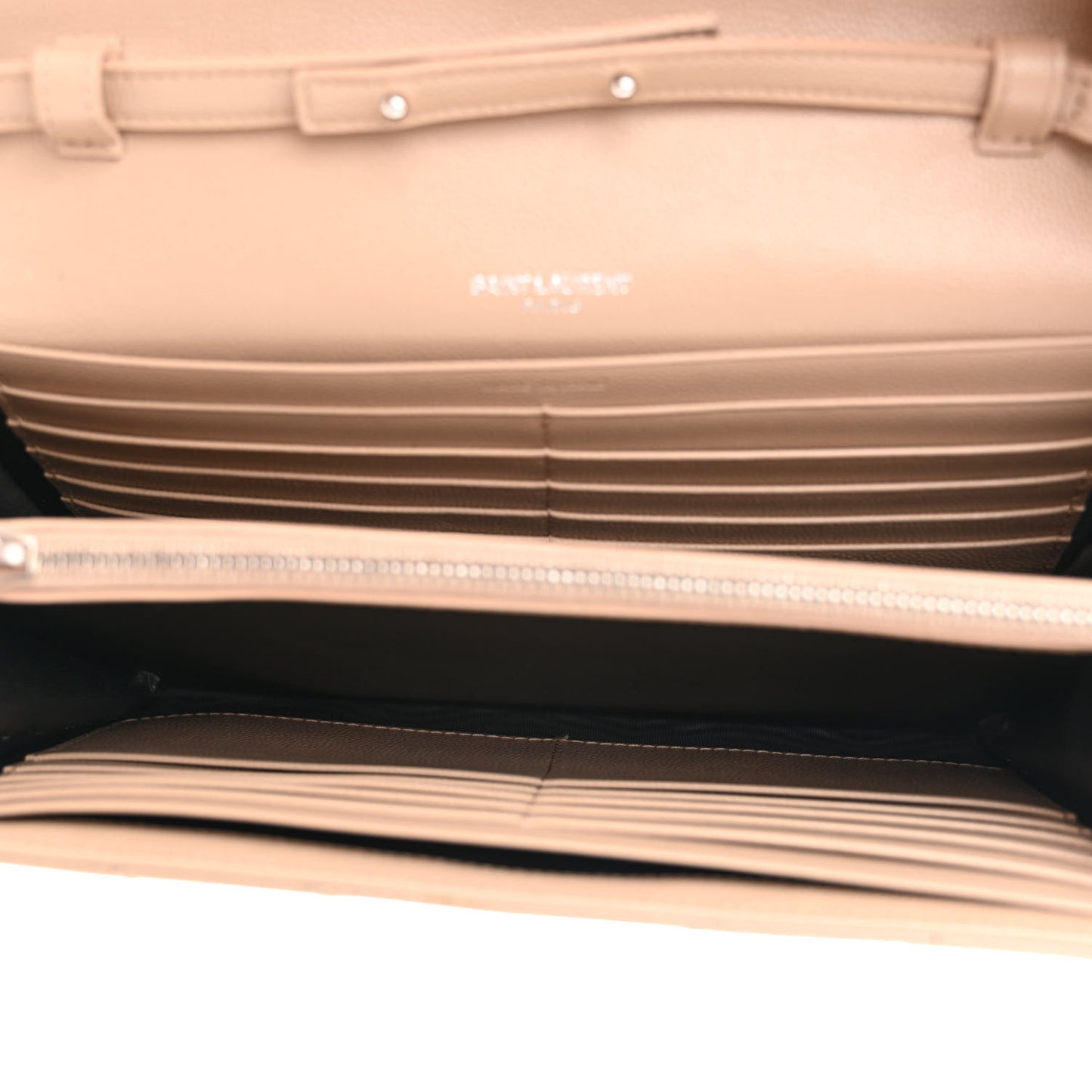 This is an authentic SAINT LAURENT Grain De Poudre Matelasse Chevron Monogram Chain Wallet in Dark Beige. This elegant wallet on a chain is crafted of pebbled calfskin leather in beige with chevron quilting. The bag features an optional silver chainlink shoulder strap and a front flap with a prominent silver YSL monogram logo. This opens to a black and beige leather interior with card slots, a patch pocket, and a zipper compartment.Follow this item for alerts. Saint Laurent is a registered trademark of Saint Laurent. FASHIONPHILE is not affiliated with Saint Laurent.