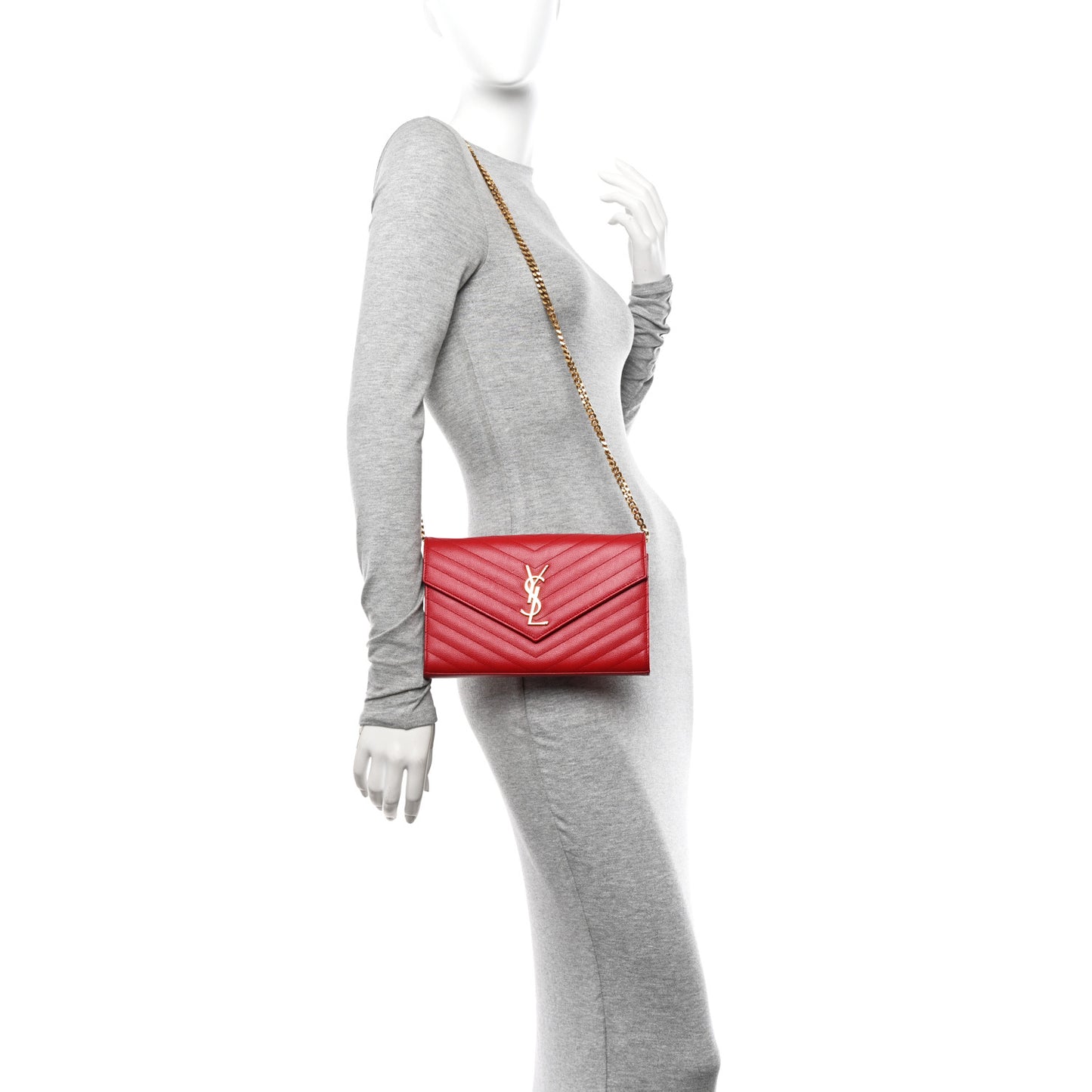 This is an authentic SAINT LAURENT Grain De Poudre Matelasse Chevron Monogram Chain Wallet in Red. This bag is crafted of grained leather in red. This clutch features a silver chain shoulder strap, a gold toned YSL logo, and a front flap closure. The flap opens to a red leather and black fabric interior with card slot panels, patch pockets, and a zipper compartment.Follow this item for alerts. Saint Laurent is a registered trademark of Saint Laurent. FASHIONPHILE is not affiliated with Saint Laurent.