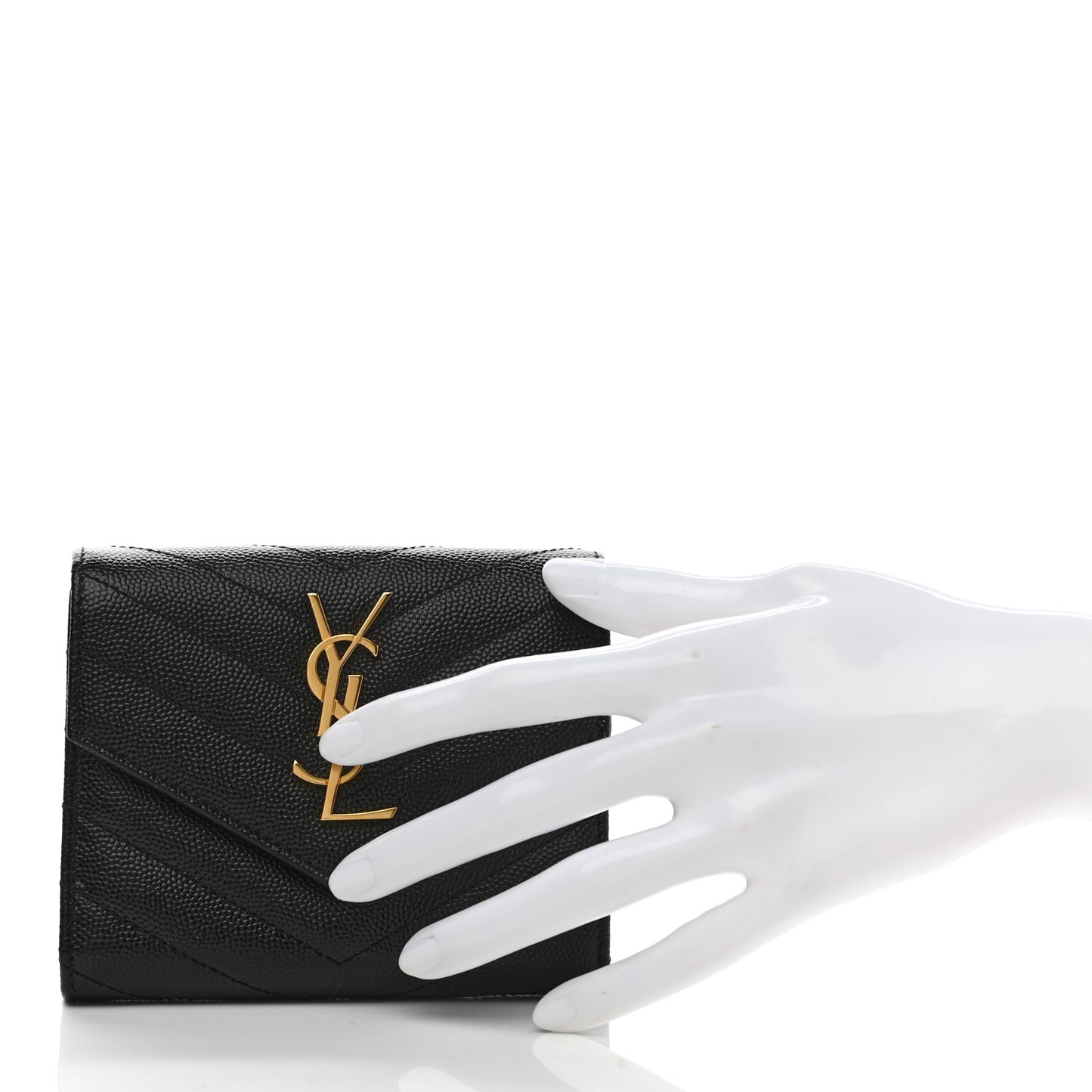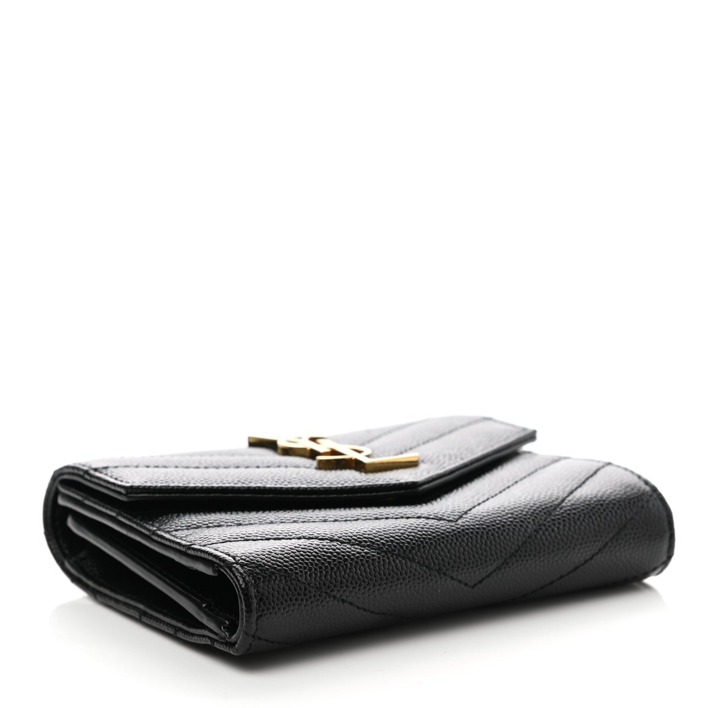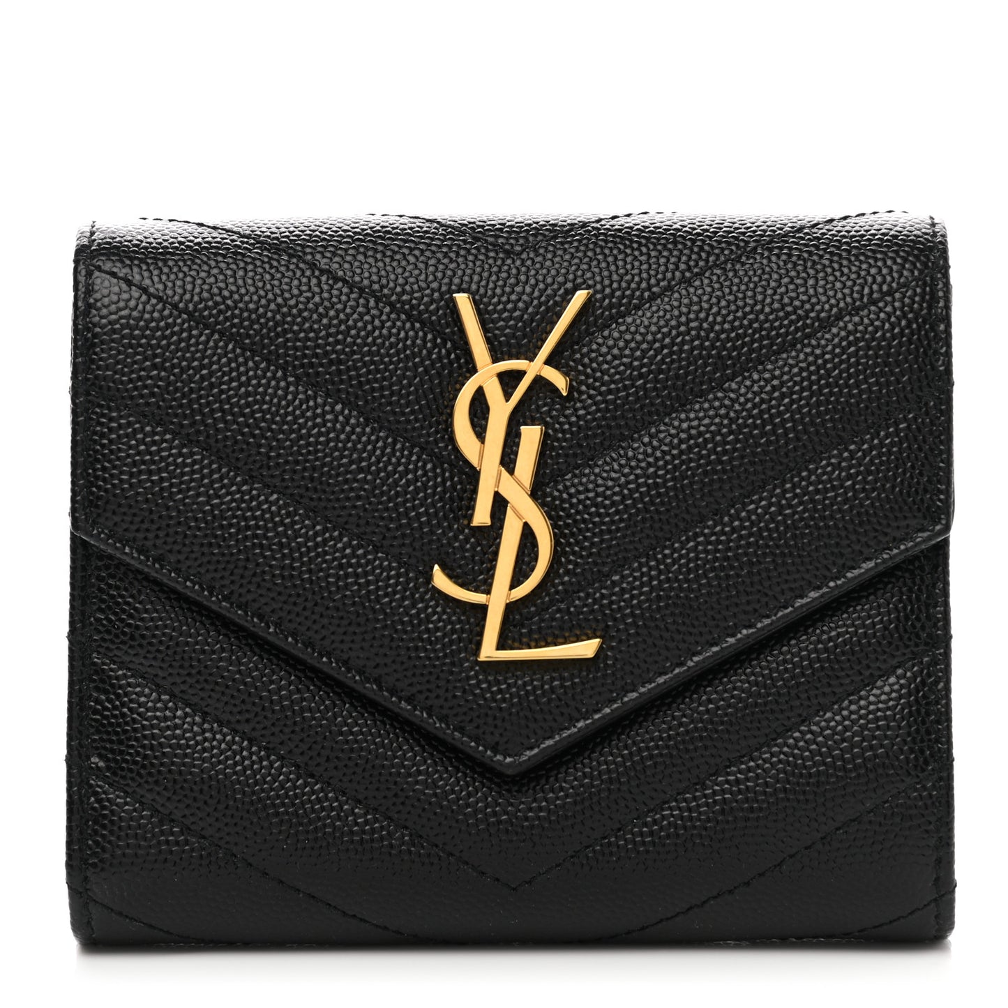 This is an authentic SAINT LAURENT Grain De Poudre Matelasse Chevron Monogram Compact Tri Fold Wallet in Black. This elegant compact wallet features fine pebbled chevron quilting in black. The wallet features a facing V-shaped flap with a prominent gold YSL logo. The flap opens to a black leather interior with card slots, patch pockets, a billfold, and a zipper compartment.Follow this item for alerts. Saint Laurent is a registered trademark of Saint Laurent. FASHIONPHILE is not affiliated with Saint Laurent.
