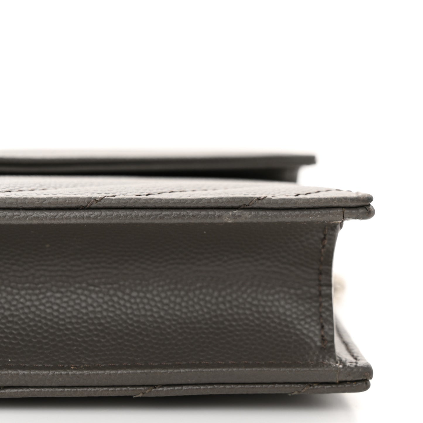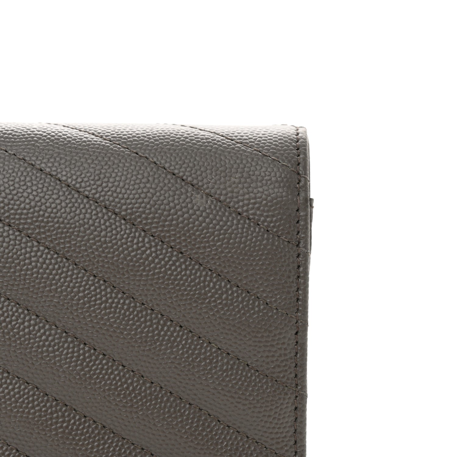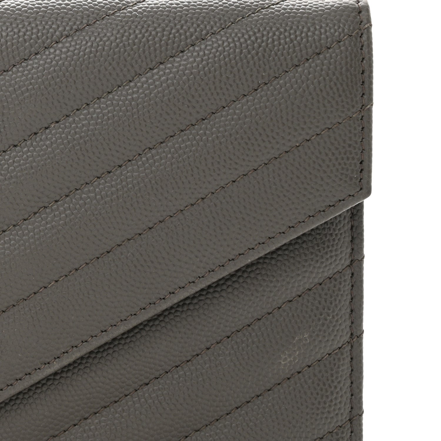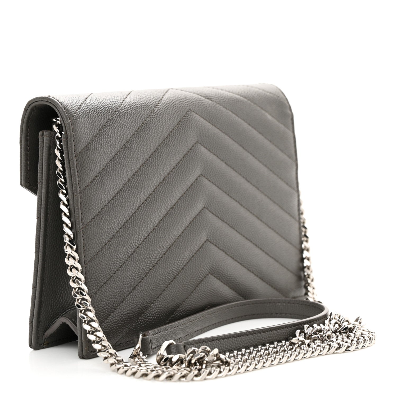 This is an authentic SAINT LAURENT Grain De Poudre Matelasse Chevron Monogram Envelope Chain Wallet in Earth. This elegant chain wallet features fine pebbled chevron-quilted leather in dark grey. The bag features an optional polished gold chain-link shoulder strap and a crossover flap with a prominent polished gold YSL logo. The flap opens to a black and grey leather interior with card slots, a patch pocket, and a zipper compartment.Follow this item for alerts. Saint Laurent is a registered trademark of Saint Laurent. FASHIONPHILE is not affiliated with Saint Laurent.