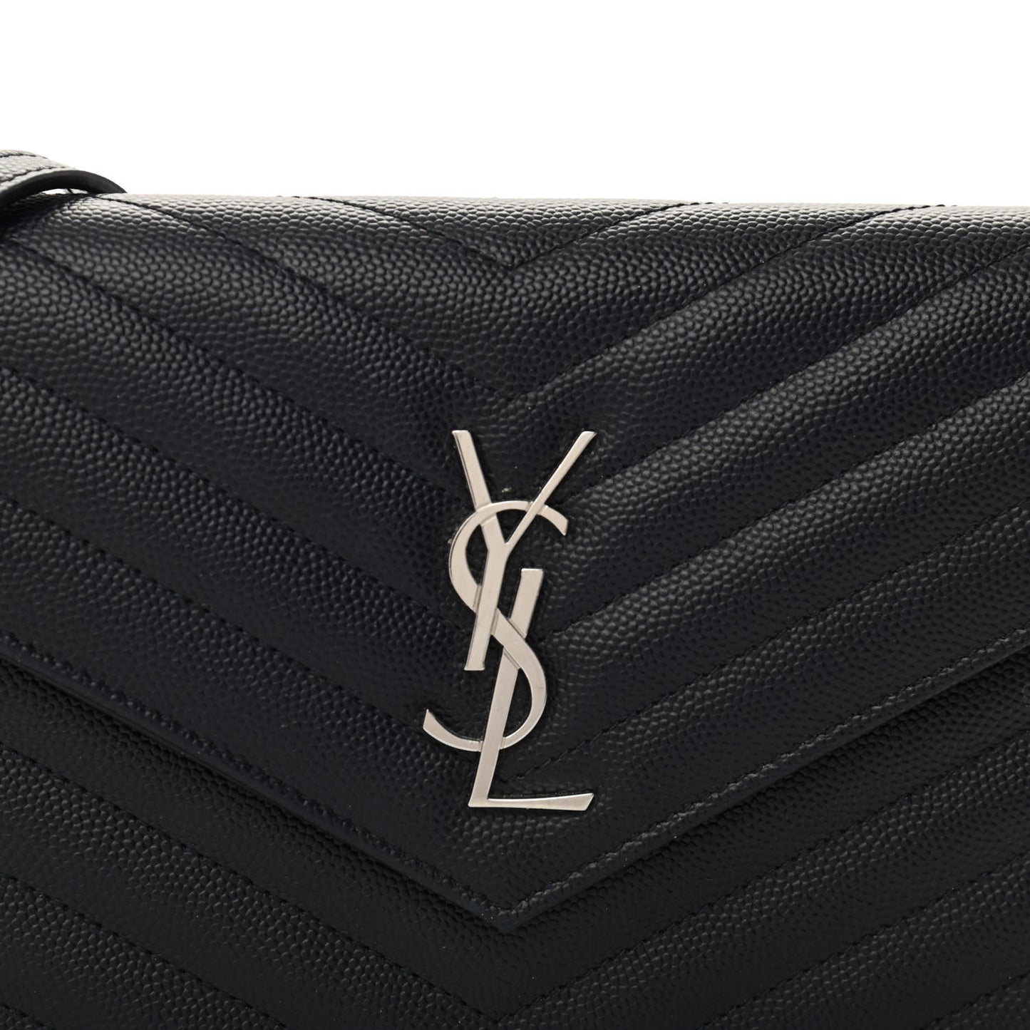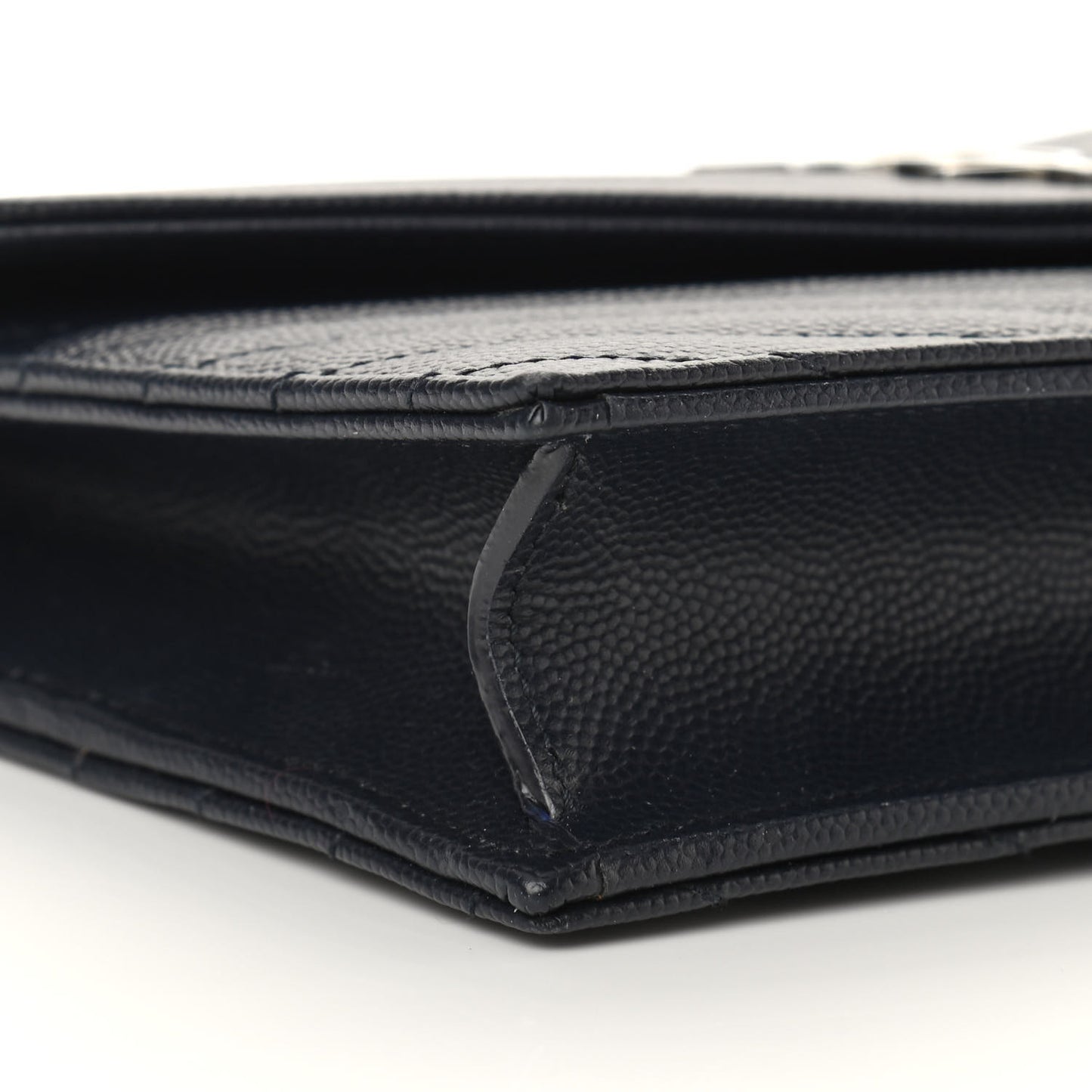 This is an authentic SAINT LAURENT Grain De Poudre Matelasse Chevron Monogram Envelope Chain Wallet in Navy. This elegant wallet on a chain is crafted of finely pebbled chevron quilted leather in dark blue. The shoulder bag features a removable waist-length bijoux silver chain shoulder strap with a shoulder pad and a silver classic YSL emblem on the flap. This opens to a black fabric interior with card slots, a zipper compartment and patch pocket.Follow this item for alerts. Saint Laurent is a registered trademark of Saint Laurent. FASHIONPHILE is not affiliated with Saint Laurent.
