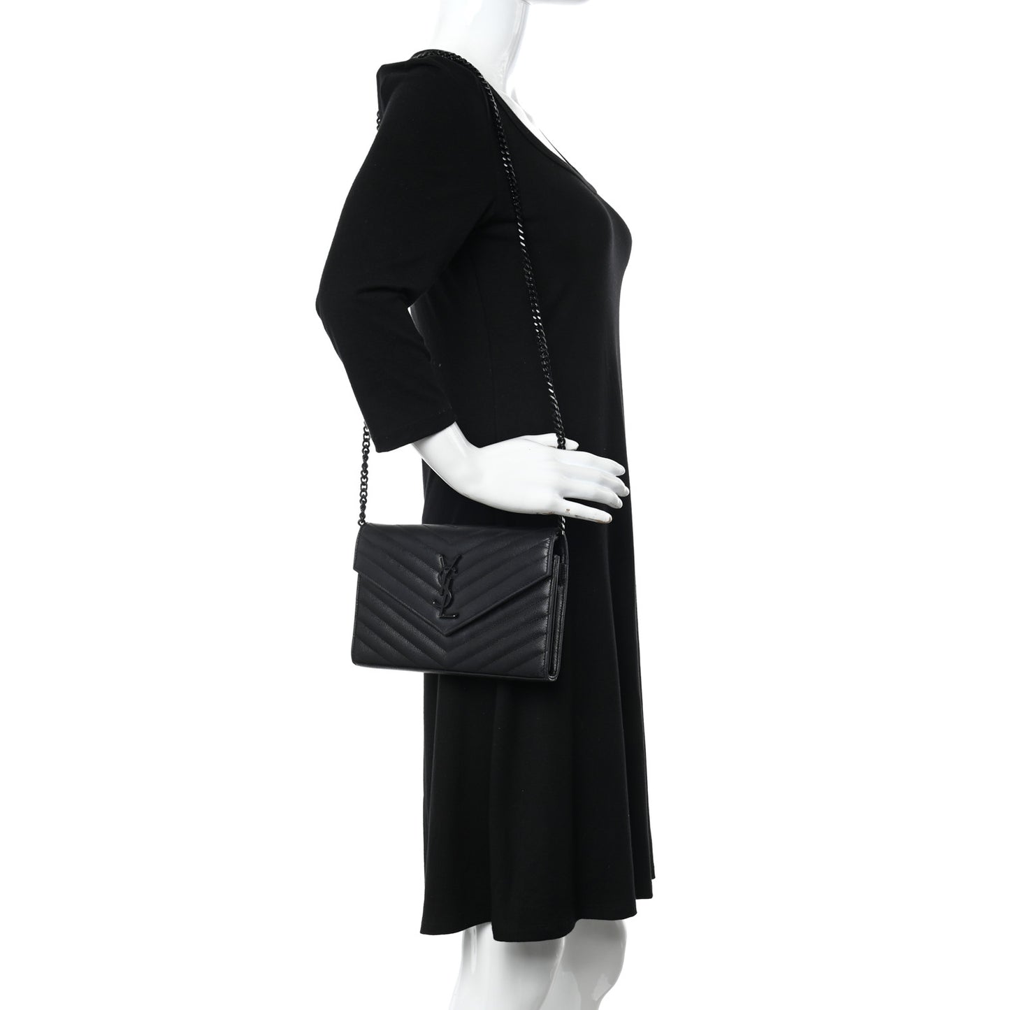 This is an authentic SAINT LAURENT Grain De Poudre Matelasse Chevron Monogram Monochrome Chain Wallet in Black. This elegant wallet on chain is crafted of pebbled black leather with chevron quilting. The clutch features a removable black crossbody strap and a classic black YSL emblem on the front flap. This opens to a black leather interior with card slots, a zipper compartment, and patch pockets.Follow this item for alerts. Saint Laurent is a registered trademark of Saint Laurent. FASHIONPHILE is not affiliated with Saint Laurent.