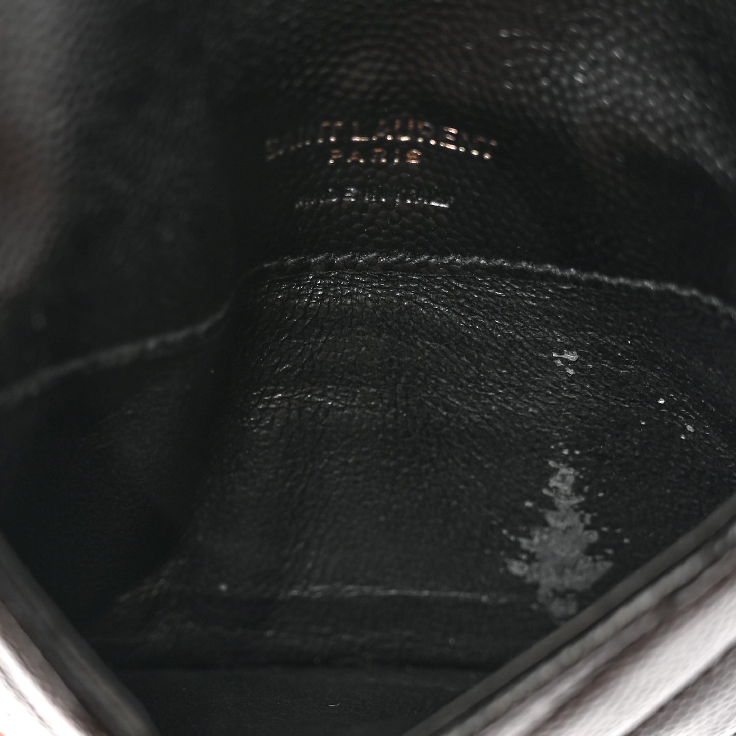 This is an authentic SAINT LAURENT Grain De Poudre Matelasse Chevron Monogram Compact Wallet in Black. This elegant wallet is crafted of fine pebbled chevron quilting in black. It features a prominent black YSL logo on the front and 5 card slots on the back. This wallet also opens with a snap to a matching leather interior pocket.Follow this item for alerts. Saint Laurent is a registered trademark of Saint Laurent. FASHIONPHILE is not affiliated with Saint Laurent.
