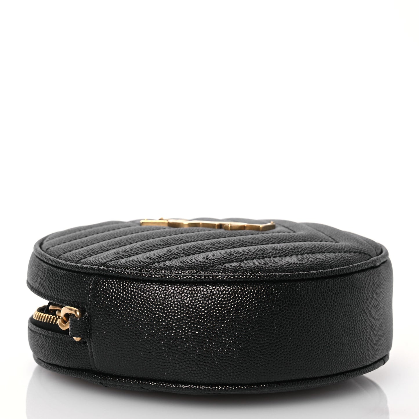 This is an authentic SAINT LAURENT Grain De Poudre Matelasse Chevron Quilted Round Vinyle Camera Bag in Black. This elegant circular crossbody features a chic chevron quilting in textured leather. The bag features a bijoux aged gold chain-link shoulder strap, top zipper, and a facing prominent YSL monogram logo. The zipper opens to a black fabric interior with a patch pocket.Follow this item for alerts. Saint Laurent is a registered trademark of Saint Laurent. FASHIONPHILE is not affiliated with Saint Laurent.