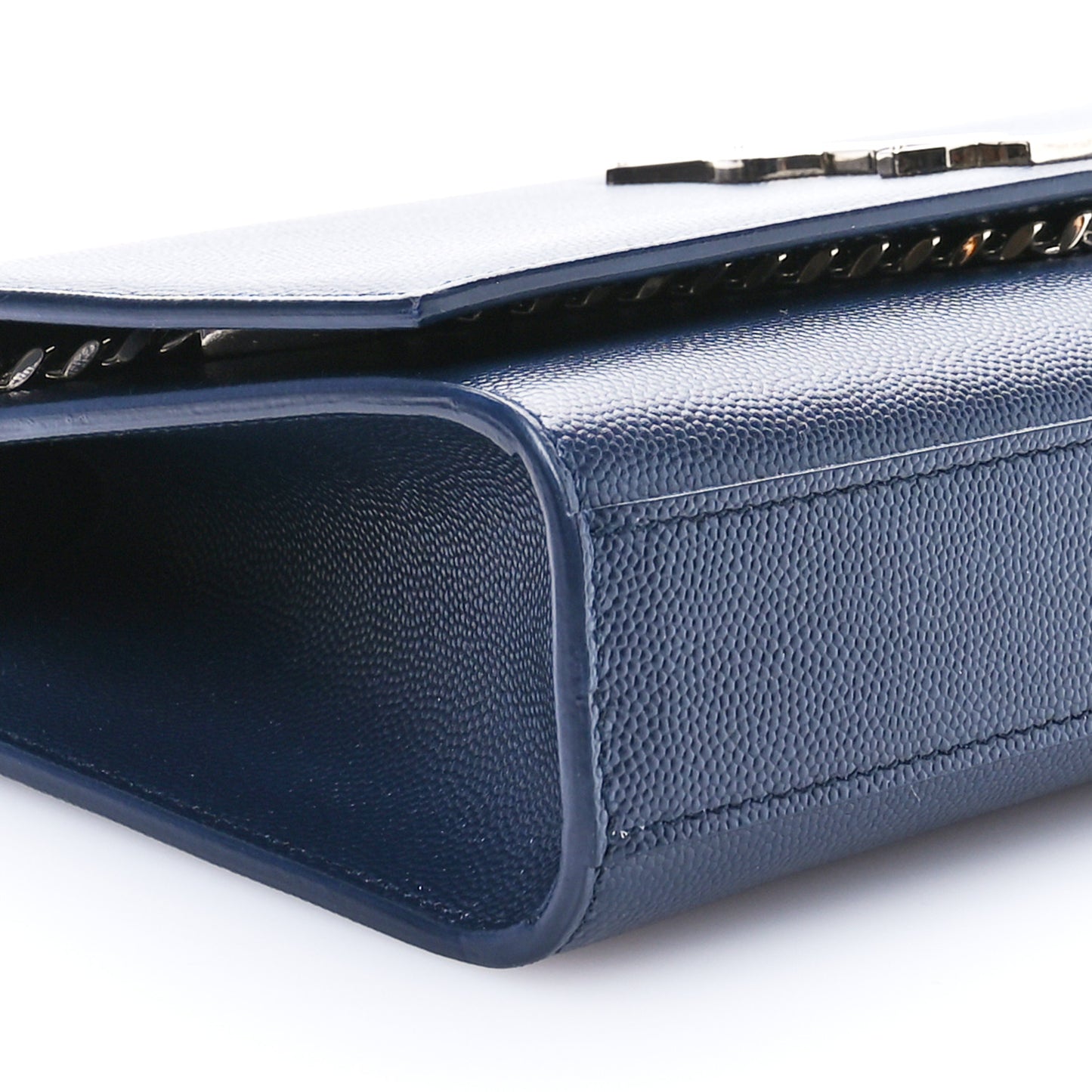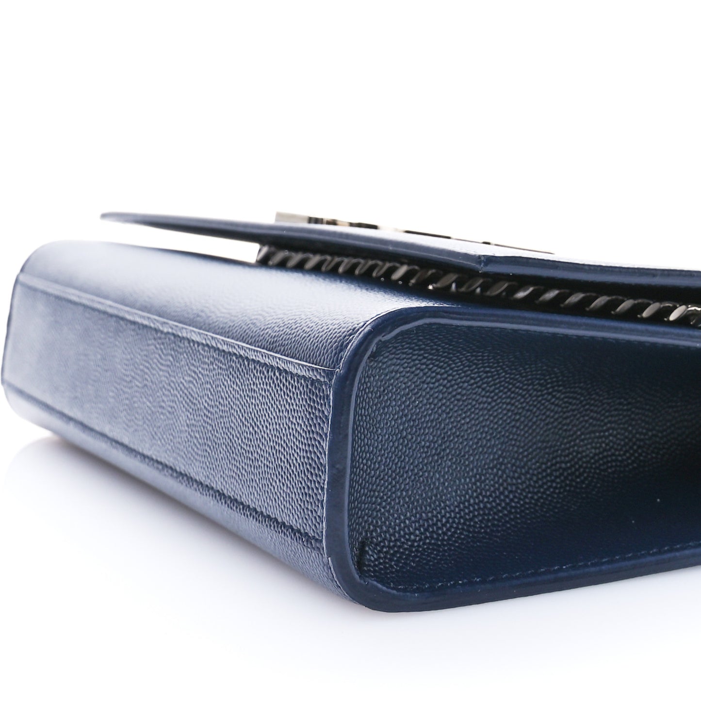 This is an authentic SAINT LAURENT Grain De Poudre Medium Classic Monogram Kate Satchel in Deep Marine. This ultra-stylish shoulder bag is finely crafted of grained calfskin leather in dark blue. The bag features a polished silver bijoux chain shoulder strap and a frontal flap with a silver YSL logo. The front flap opens to a black fabric interior with a patch pocket.Follow this item for alerts. Saint Laurent is a registered trademark of Saint Laurent. FASHIONPHILE is not affiliated with Saint Laurent.