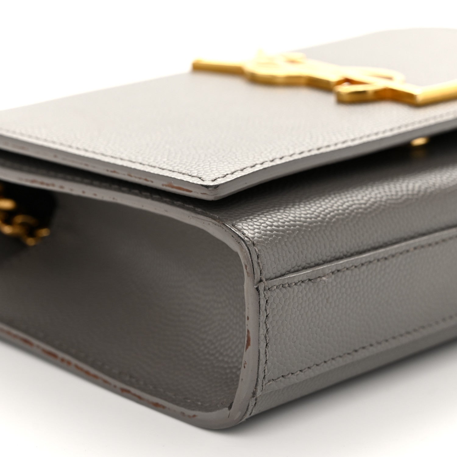 This is an authentic SAINT LAURENT Grain De Poudre Small Monogram Kate Satchell in Earth. This stylish shoulder bag is crafted of fine textured leather in grey. The bag features a gold chain link shoulder strap with a gold YSL logo on the face. This structured bag opens to a black fabric interior with a small patch pocket.Follow this item for alerts. Saint Laurent is a registered trademark of Saint Laurent. FASHIONPHILE is not affiliated with Saint Laurent.
