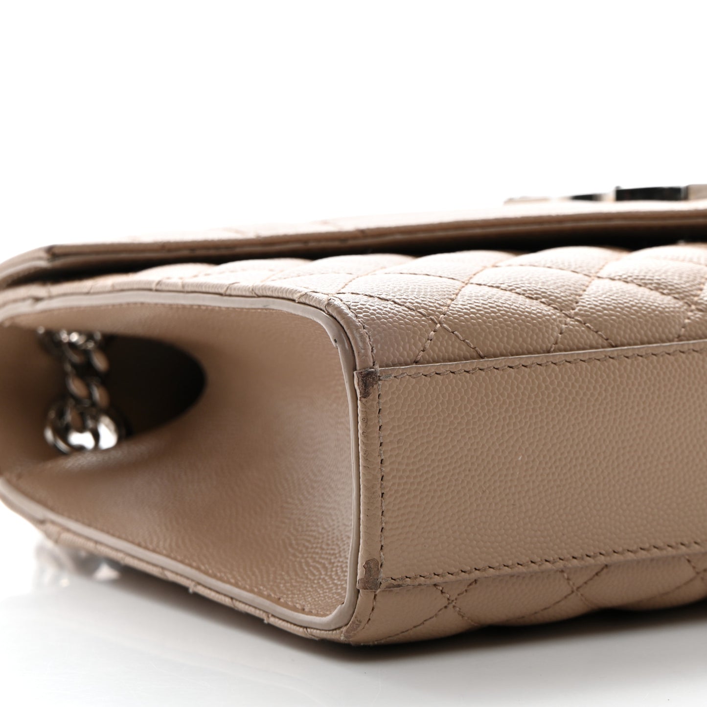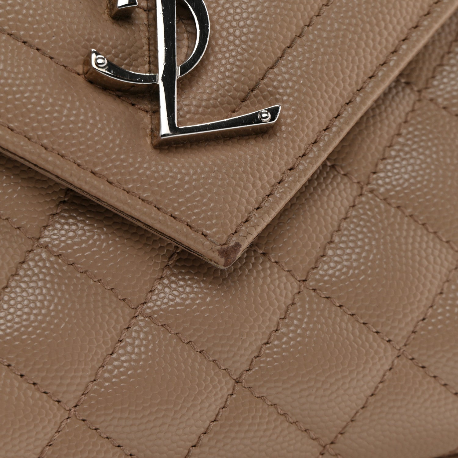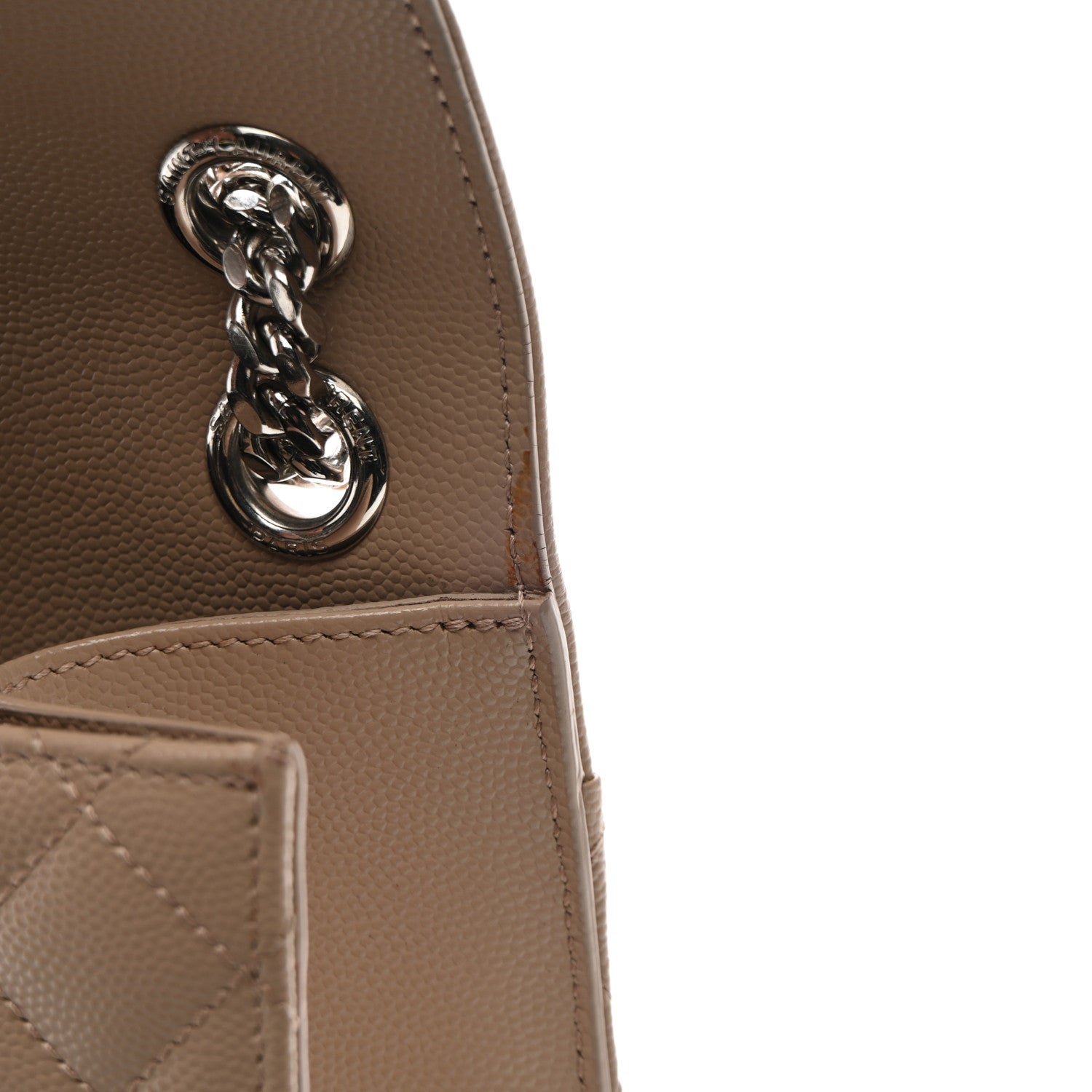 This is an authentic SAINT LAURENT Grain De Poudre Textured Mixed Matelasse Medium Triquilt Monogram Satchel in Dark Beige. This elegant shoulder bag features quilted leather in beige. The bag features a silver chain-link shoulder strap with a leather shoulder pad. The frontal flap features a prominent silver YSL monogram detail and opens to a black fabric interior with a patch pocket.Follow this item for alerts. Saint Laurent is a registered trademark of Saint Laurent. FASHIONPHILE is not affiliated with Saint Laurent.