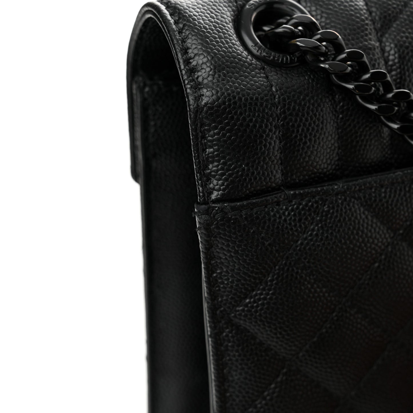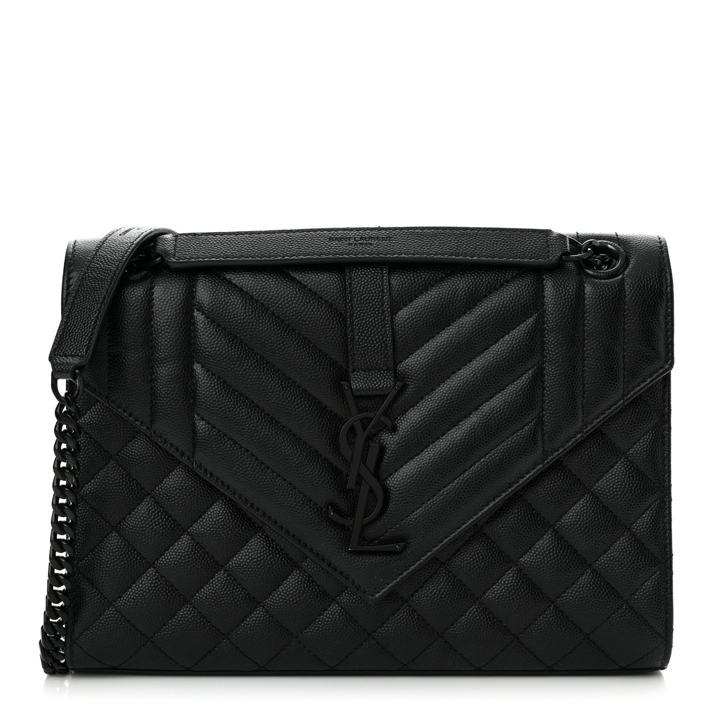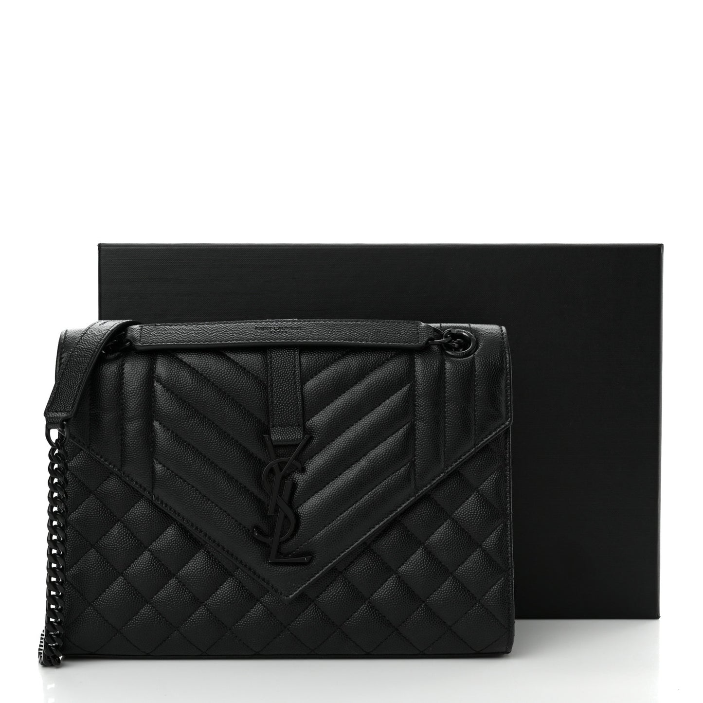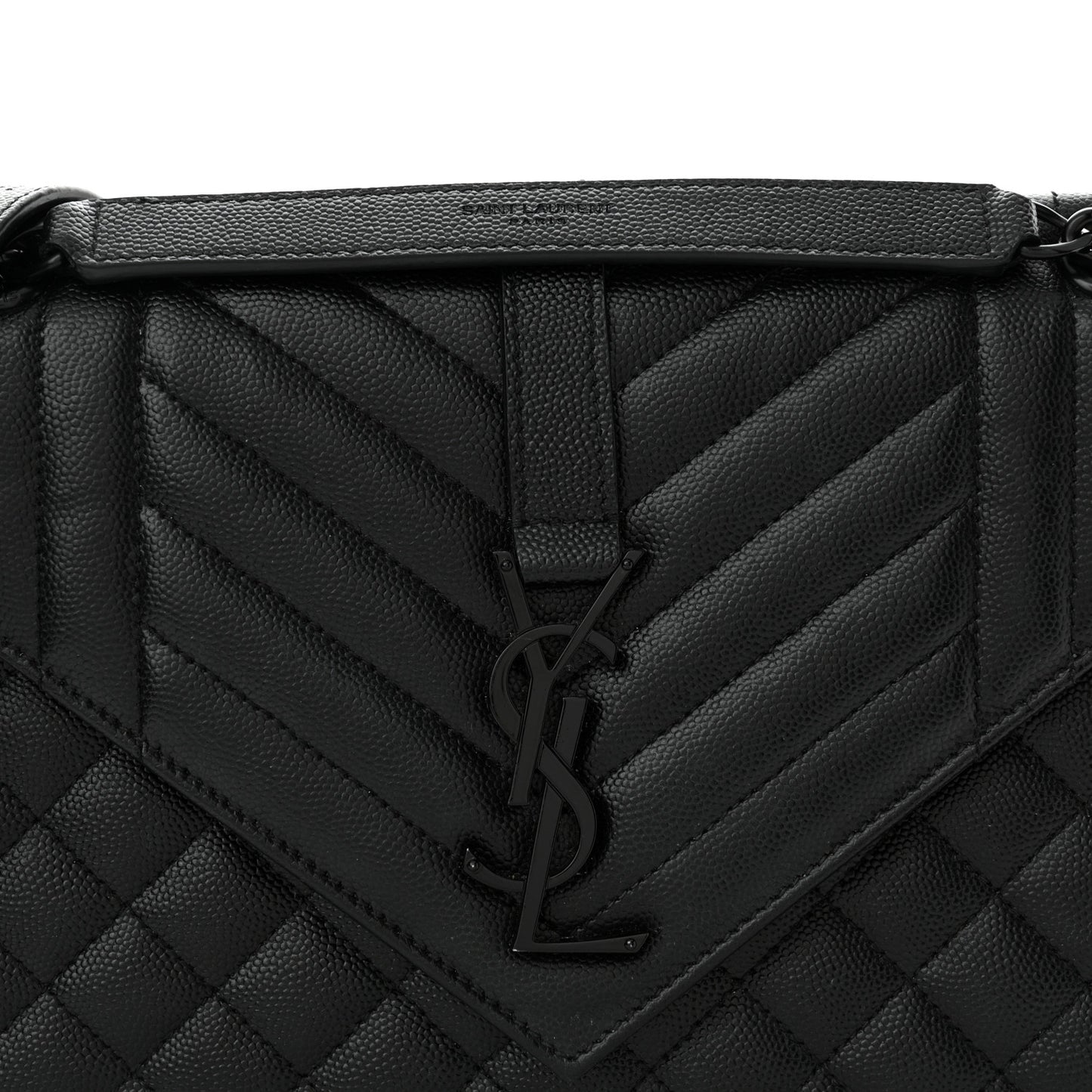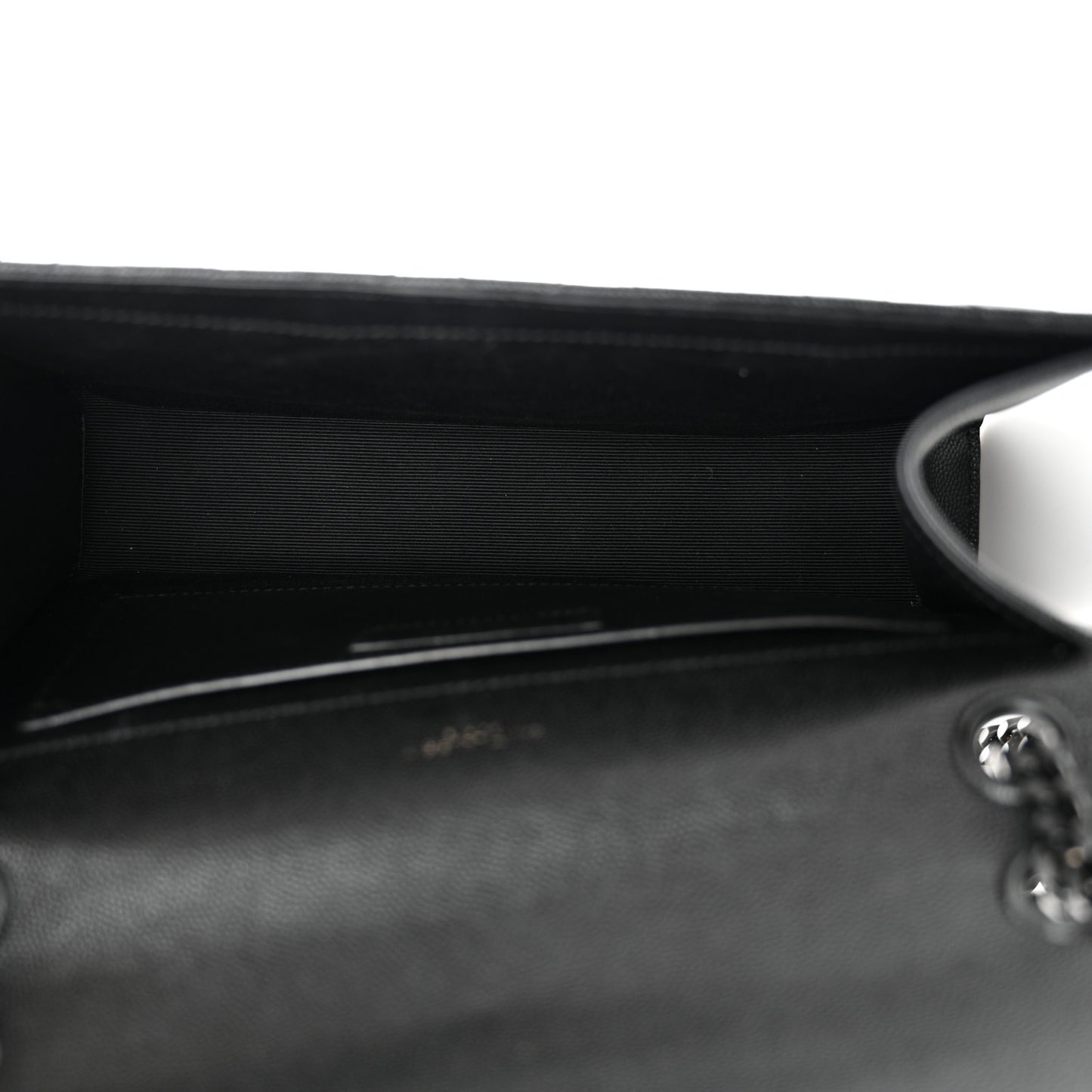 This is an authentic SAINT LAURENT Grain De Poudre Textured Mixed Matelasse Triquilt Medium Monogram Monochrome Satchel in Black. This elegant shoulder bag is crafted of grained calfskin leather in black. The bag features a large exterior flat pocket, black chain-link shoulder straps with leather shoulder pads and an envelope-style flap with a black YSL monogram closure. This opens with a magnetic snap to a black fabric interior with a patch pocket.Follow this item for alerts. Saint Laurent is a registered trademark of Saint Laurent. FASHIONPHILE is not affiliated with Saint Laurent.