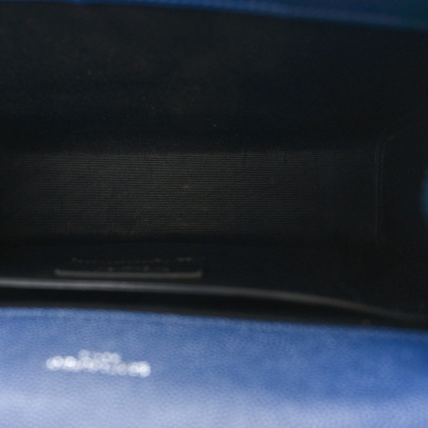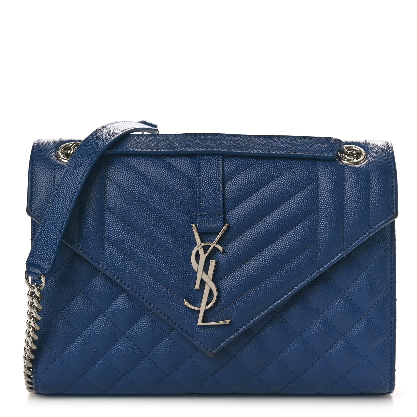 This is an authentic SAINT LAURENT Grain De Poudre Textured Mixed Matelasse Triquilt Medium Monogram Satchel in Denim. This elegant shoulder tote is crafted of grained leather in blue with chevron, linear and diamond quilting. The bag features a large exterior flat pocket, polished silver chain link shoulder straps with leather shoulder pads and an envelope style flap with a silver YSL monogram closure. This opens with a magnetic snap to a black fabric interior with a patch pocket.Follow this item for alerts. Saint Laurent is a registered trademark of Saint Laurent. FASHIONPHILE is not affiliated with Saint Laurent.