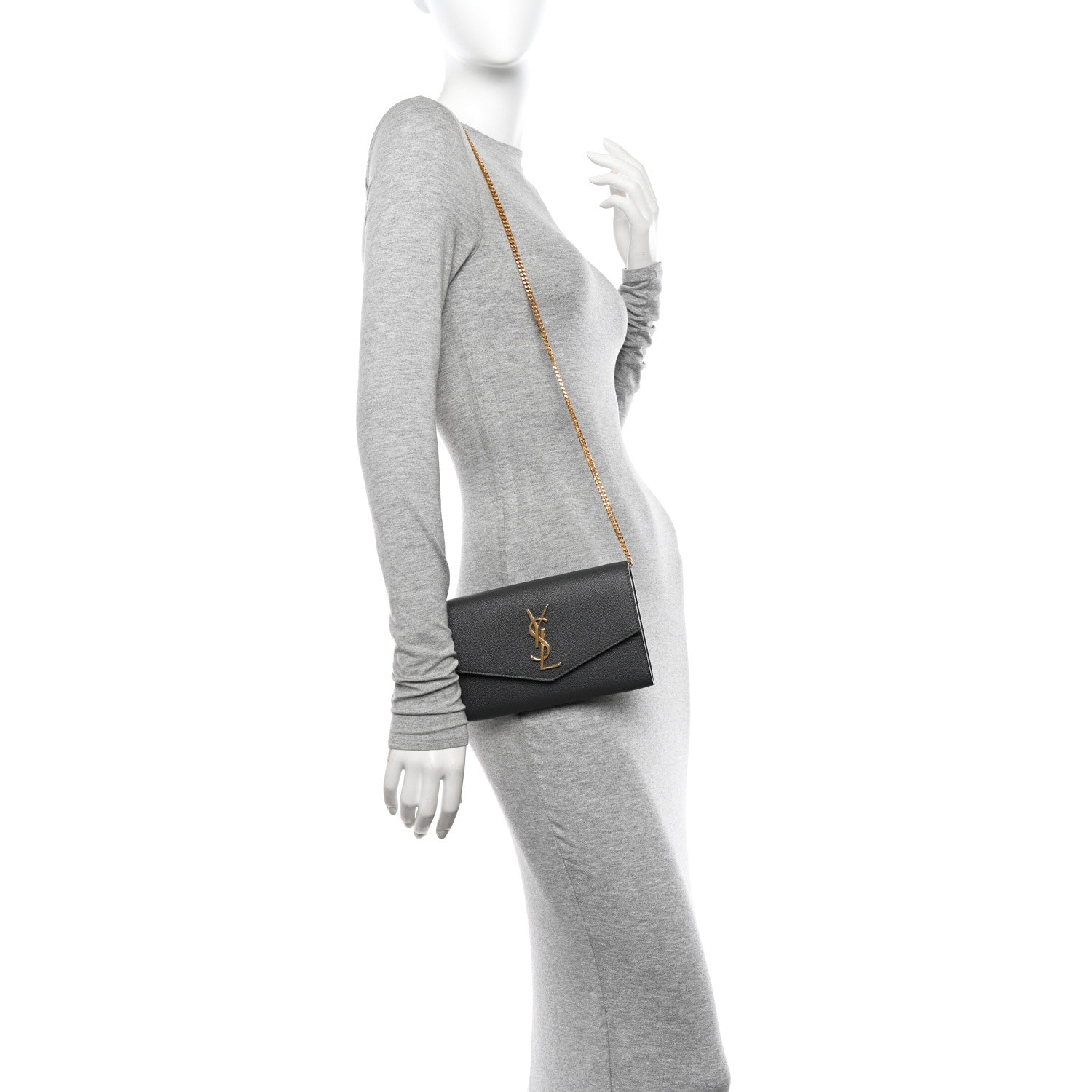This is an authentic SAINT LAURENT Grain de Poudre Uptown Chain Wallet in Storm. This tote is crafted of pebbled calfskin leather in gray. The bag features an optional polished gold chain strap and a matching gold YSL monogram detail on the crossover flap. The bag opens to a black leather interior with a patch pocket and removable insert.Follow this item for alerts. Saint Laurent is a registered trademark of Saint Laurent. FASHIONPHILE is not affiliated with Saint Laurent.